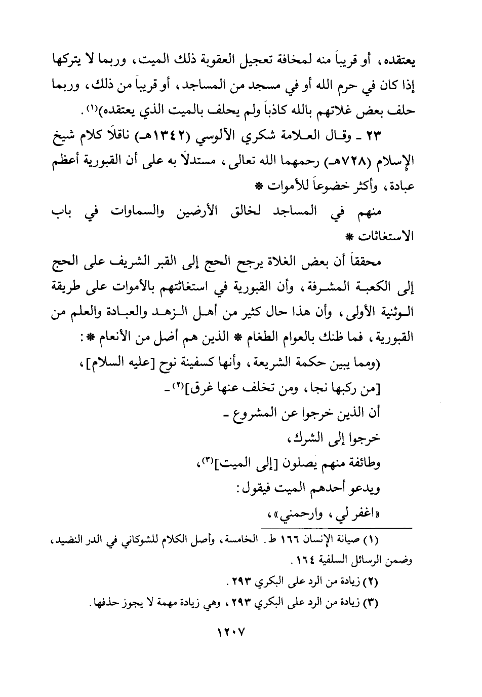 23- وقال العلامة شكري الآلوسي (1342هـ) ناقلا كلام شيخ الإسلام (728هـ) رحمهما الله تعالى، مستدلا به على أن القبورية أعظم عبادة، وأكثر خضوعا للأموات * منهم في المساجد لخالق الأرضين والسماوات في باب الاستغاثات* محققا أن بعض الغلاة يرجح الحج إلى القبر الشريف على الحج إلى الكعبة المشرفة، وأن القبورية في استغاثتهم بالأموات على طريقة الوثنية الأولى، وأن هذا حال كثير من أهل الزهد والعبادة والعلم من القبورية، فما ظنك بالعوام الطغام* الذين هم أضل من الأنعام*: