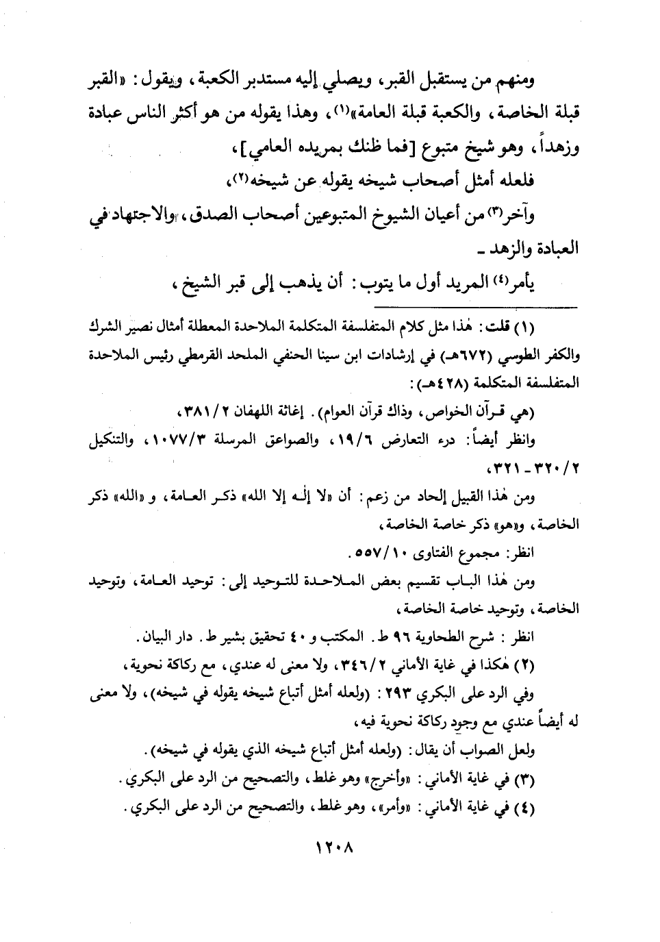 ومنهم من يستقبل القبر، ويصلي إليه مستدبر الكعبة، ويقول: " القبر قبلة الخاصة، والكعبة قبلة العامة "، وهذا يقوله من هو أكثر الناس عبادة وزهدا، وهو شيخ متبوع [فما ظنك بمريده العامي] ، فلعله أمثل أصحاب شيخه يقوله عن شيخه، وآخر من أعيان الشيوخ المتبوعين أصحاب الصدق، والاجتهاد في العبادة والزهد- يأمر المريد أول ما يتوب: أن يذهب إلى قبر الشيخ،