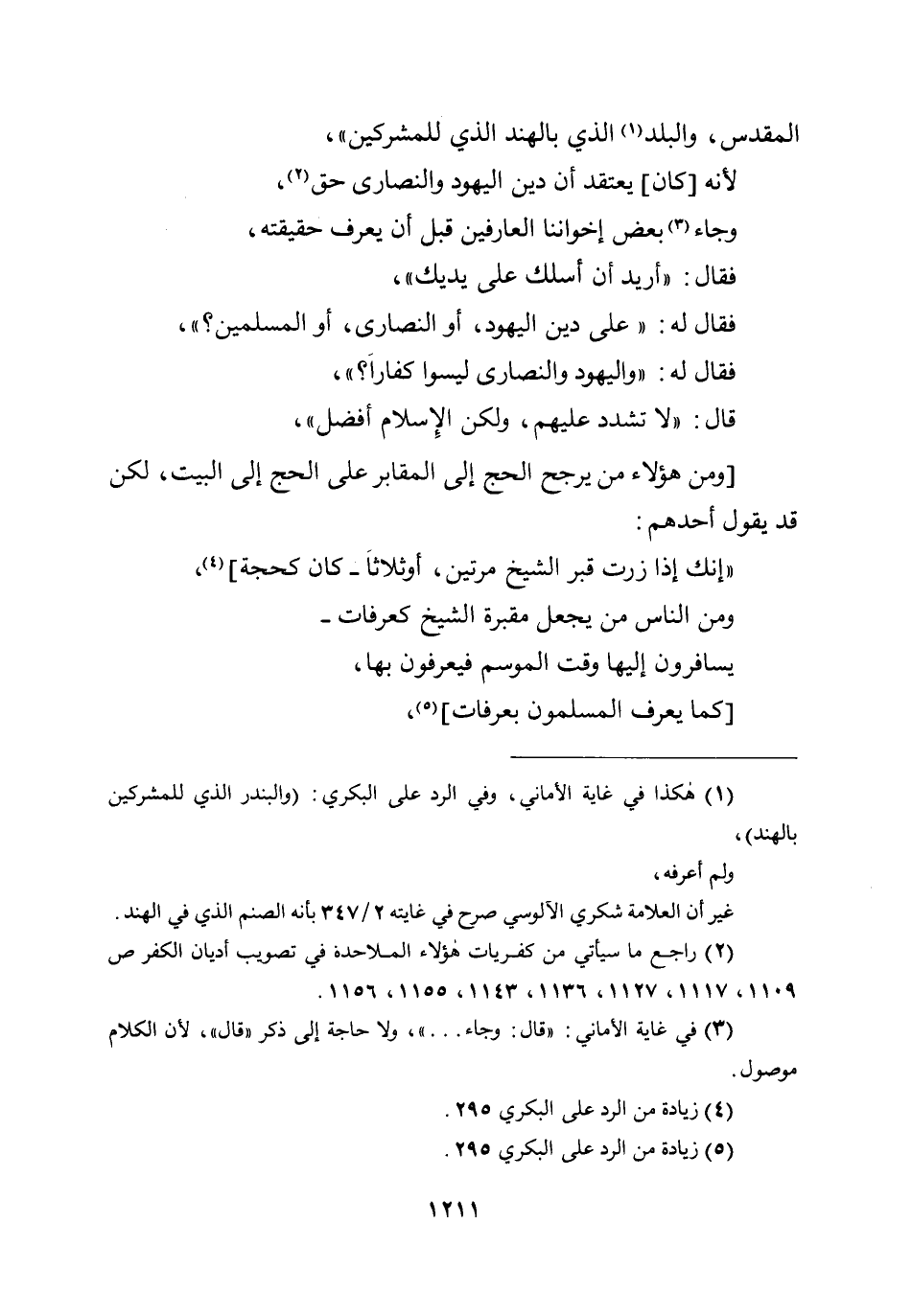 المقدس، والبلد الذي بالهند الذي للمشركين"، لأنه [كان] يعتقد أن دين اليهود والنصارى حق، وجاء بعض إخواننا العارفين قبل أن يعرف حقيقته، فقال: " أريد أن أسلك على يديك "، فقال له: " على دين اليهود، أو النصارى، أو المسلمين؟ "، فقال له: " واليهود والنصارى ليسوا كفارا؟ "، قال: " لا تشدد عليهم، ولكن الإسلام أفضل "، [ومن هؤلاء من يرجح الحج إلى المقابر على الحج إلى البيت، لكن قد يقول أحدهم: