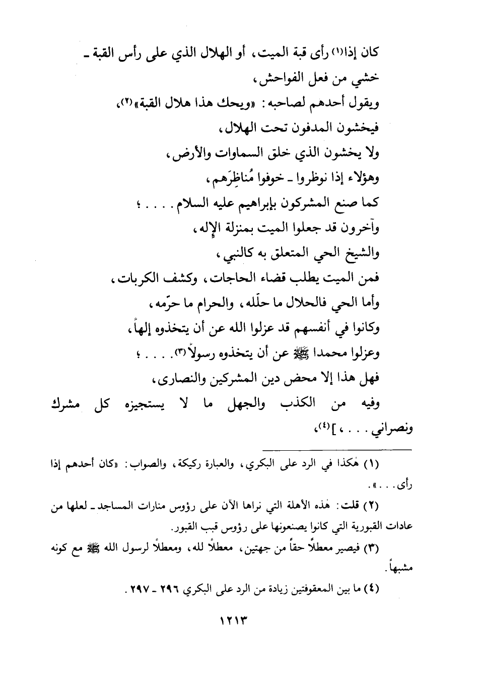 كان إذا رأى قبة الميت، أو الهلال الذي على رأس القبة- خشي من فعل الفواحش، ويقول أحدهم لصاحبه: " ويحك هذا هلال القبة "، فيخشون المدفون تحت الهلال، ولا يخشون الذي خلق السماوات والأرض، وهؤلاء إذا نوظروا- خوفوا مُناظرهم، كما صنع المشركون بإبراهيم عليه السلام ... ؛ وآخرون قد جعلوا الميت بمنزلة الإله، والشيخ الحي المتعلق به كالنبي، فمن الميت يطلب قضاء الحاجات، وكشف الكربات، وأما الحي فالحلال ما حلّله، والحرام ما حرّمه، وكانوا في أنفسهم قد عزلوا الله عن أن يتخذوها إلها، وعزلوا محمدا صلى الله عليه وسلم عن أن يتخذوه رسولا ... ؛ فهل هذا إلا محض دين المشركين والنصارى، وفيه من الكذب والجهل ما لا يستجيزه كل مشرك ونصراني....،] ،