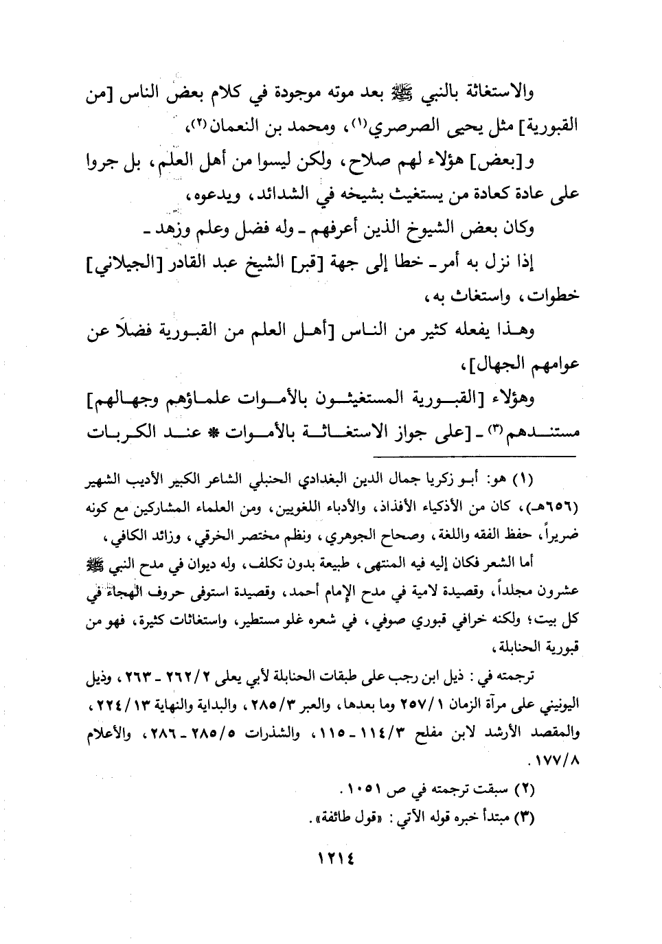 والاستغاثة بالنبي صلى الله عليه وسلم بعد موته موجودة في كلام بعض الناس [من القبورية] مثل يحيى الصرصري، ومحمد بن النعمان، و [بعض] هؤلاء لهم صلاح، ولكن ليسوا من أهل العلم، بل جروا على عادة كعادة من يستغيث بشيخه في الشدائد، ويدعوه، وكان بعض الشيوخ الذين أعرفهم- وله فضل وعلم وزهد- إذا نزل به أمر- خطا إلى جهة [قبر] الشيخ عبد القادر [الجيلاني] خطوات، واستغاث به، وهذا يفعله كثير من الناس [أهل العلم من القبورية فضلا عن عوامهم الجهال] ، وهؤلاء [القبورية المستغيثون بالأموات علماؤهم وجهالهم] مستندهم-[على جواز الاستغاثة بالأموات* عند الكربات