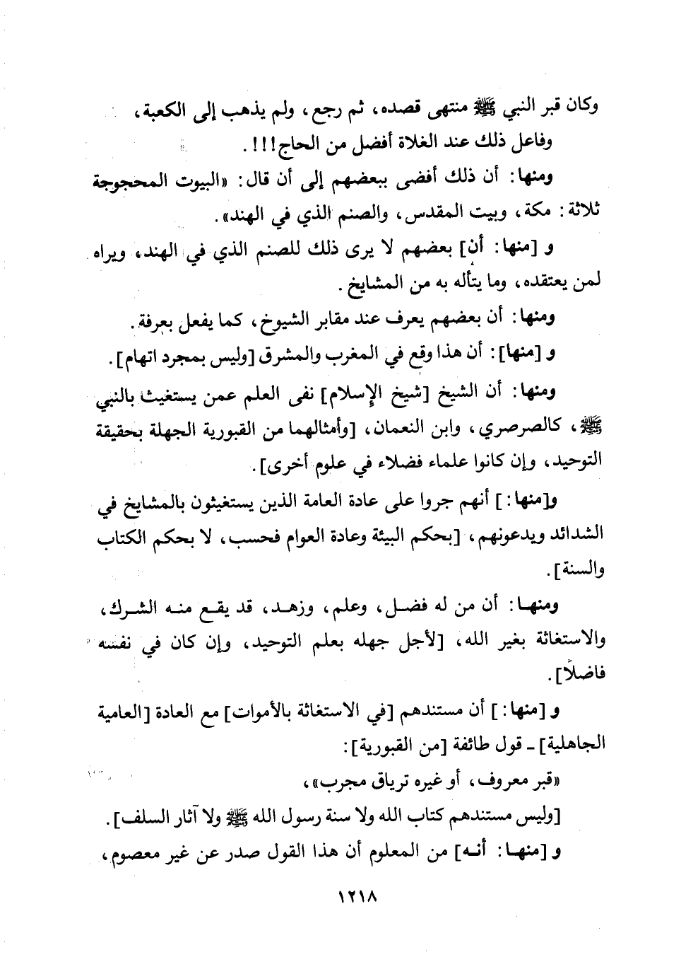 وكان قبر النبي صلى الله عليه وسلم منتهى قصده، ثم رجع، ولم يذهب إلى الكعبة، وفاعل ذلك عند الغلاة أفضل من الحاج!!! ومنها: أن ذلك أفضى ببعضهم إلى أن قال: " البيوت المحجوجة ثلاثة: مكة، وبيت المقدس، والصنم الذي في الهند ".