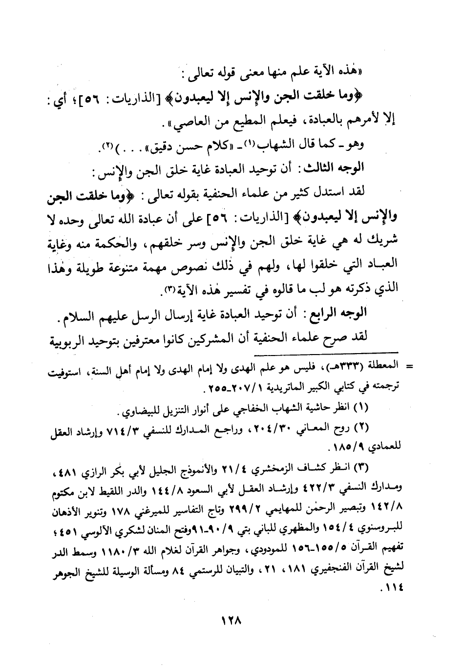 لقد استدل كثير من علماء الحنفية بقوله تعالى: {وَمَا خَلَقْتُ الْجِنَّ وَالْإِنْسَ إِلَّا لِيَعْبُدُونِ} [الذاريات: 56] على أن عبادة الله تعالى وحده لا شريك له هي غاية خلق الجن والإنس وسر خلقهم، والحكمة منه وغاية العباد التي خلقوا لها، ولهم في ذلك نصوص مهمة متنوعة طويلة وهذا الذي ذكرته هو لب ما قالوه في تفسير هذه الآية.