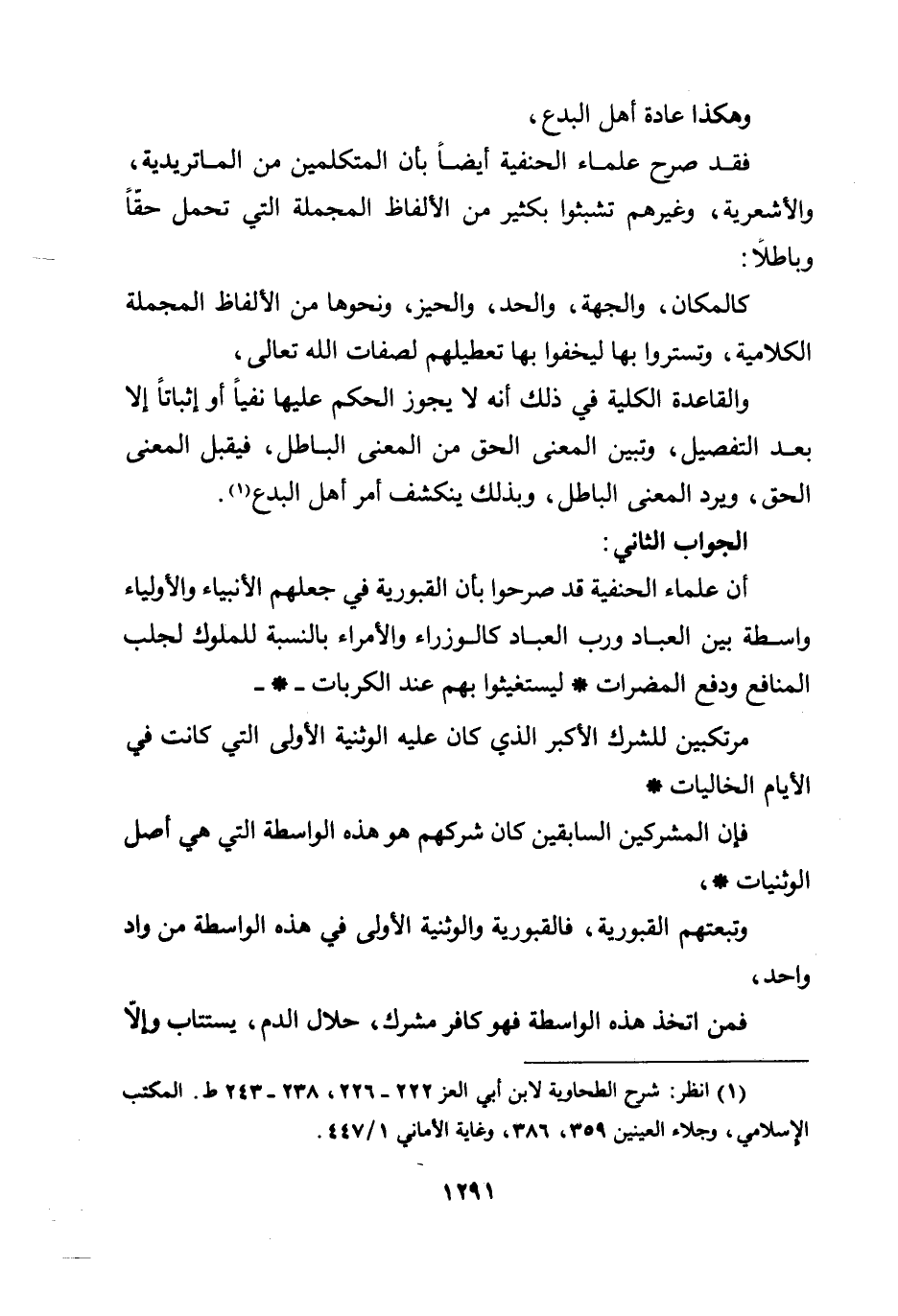 أن علماء الحنفية قد صرحوا بأن القبورية في جعلهم الأنبياء والأولياء واسطة بين العباد ورب العباد، كالوزراء والأمراء بالنسبة للملوك لجلب المنافع ودفع المضرات * ليستغيثوا بهم عند الكربات - * مرتكبين للشرك الأكبر الذي كان عليه الوثنية الأولى التي كانت في الأيام الخاليات *