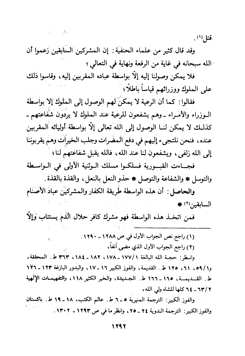 فجاءت القبورية فسلكوا مسلك الوثنية الأولى في الواسطة والتوسل * والشفاعة والتوصل * حذو النعل بالنعل، والقذة بالقذة.