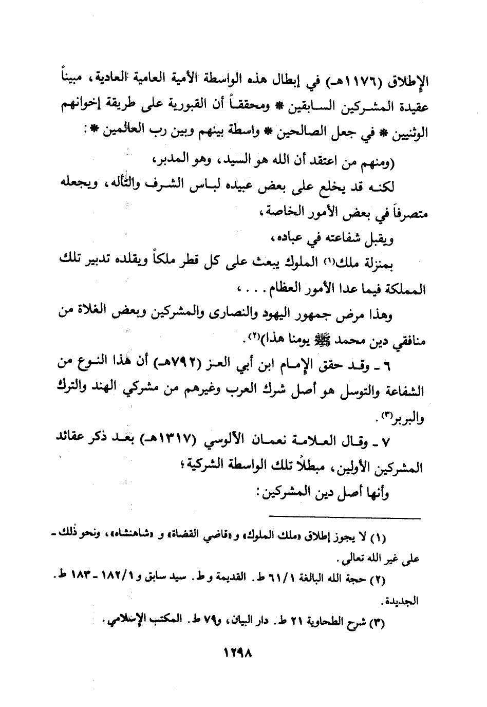 الإطلاق (1176هـ) في إبطال هذه الواسطة الأمية العامية العادية، مبيناً عقيدة المشركين السابقين * ومحققاً أن القبورية على طريقة إخوانهم الوثنيين * في جعل الصالحين * واسطة بينهم وبين رب العالمين *:
