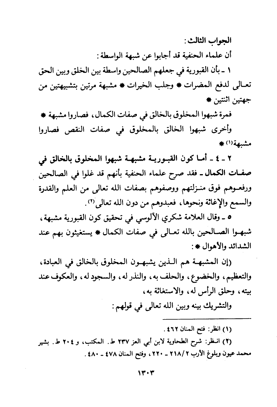 2 - 4- أما كون القبورية مشبهة شبهوا المخلوق بالخالق في صفات الكمال - فقد صرح علماء الحنفية بأنهم قد غلوا في الصالحين ورفعوهم فوق منزلتهم ووصفوهم بصفات الله تعالى من العلم والقدرة والسمع والإغاثة ونحوها، فعبدوهم من دون الله تعالى.