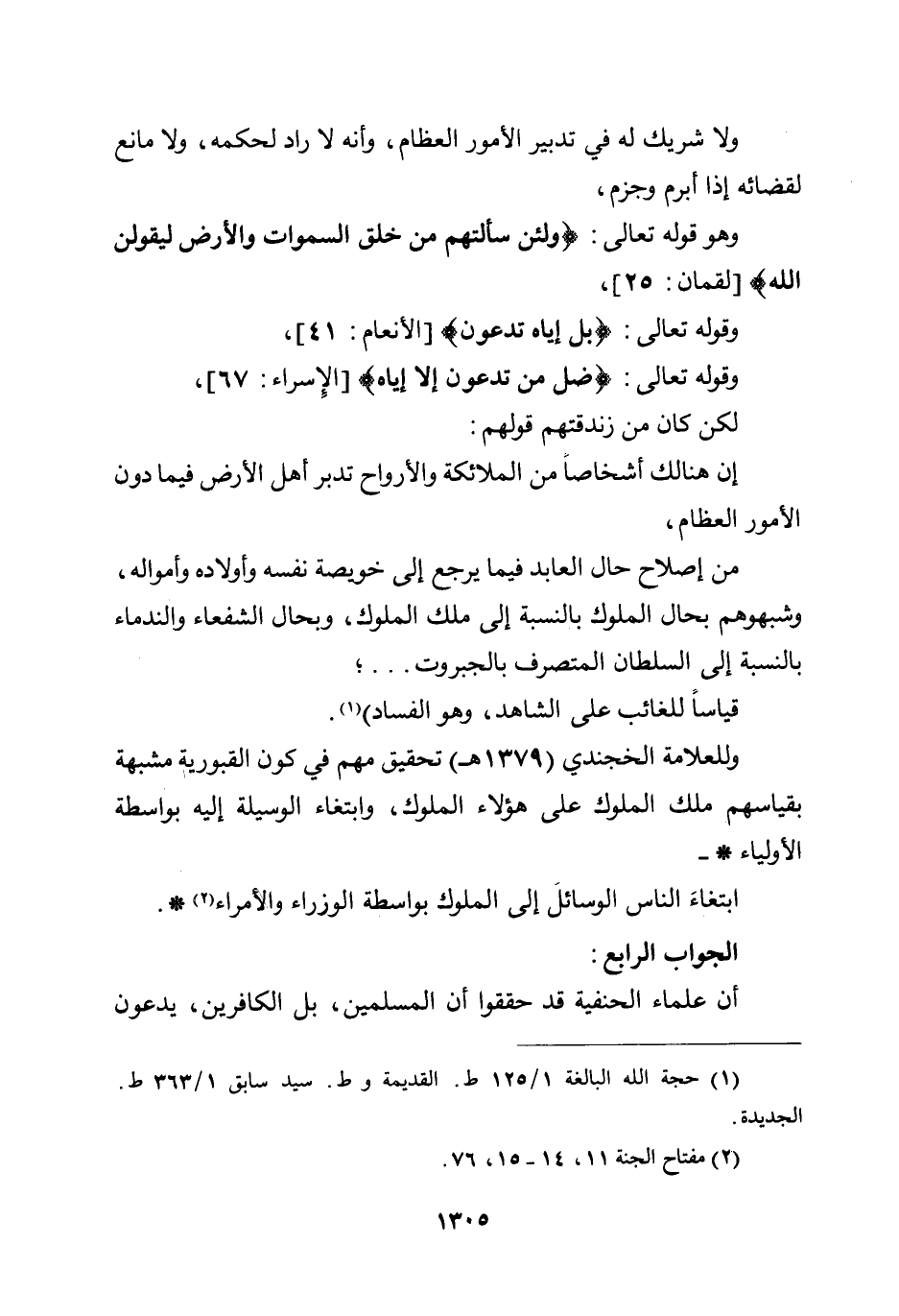 وللعلامة الخجندي (1379هـ) تحقيق منهم في كون القبورية مشبهة بقياسهم ملك الملوك على هؤلاء الملوك، وابتغاء الوسيلة إليه بواسطة الأولياء - ابتغاء الناس الوسائل إلى الملوك بواسطة الوزراء والأمراء *.