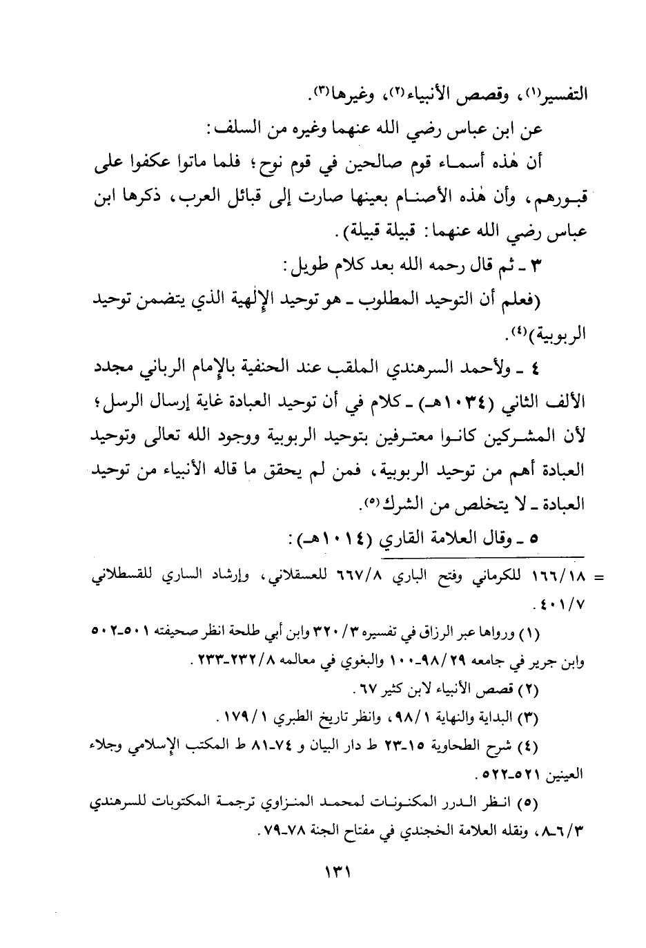 4 - ولأحمد السرهندي الملقب عند الحنفية بالإمام الرباني مجدد الألف الثاني (1034هـ) - كلام في أن توحيد العبادة غاية إرسال الرسل؛ لأن المشركين كانوا معترفين بتوحيد الربوبية ووجود الله تعالى، وتوحيد العبادة أهم من توحيد الربوبية، فمن لم يحقق ما قاله الأنبياء من توحيد العبادة - لا يتخلص من الشرك.