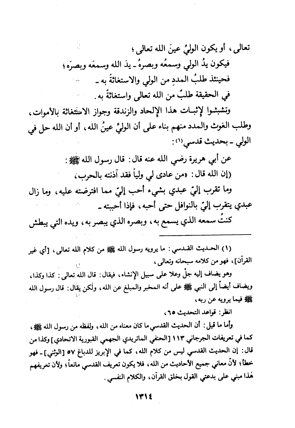 تعالى، أو يكون الولي عين الله تعالى؛ فيكون يد الولي وسمعه وبصره - يد الله وسمعه وبصره؛ فحينئذ طلب المدد من الولي والاستغاثة به - في الحقيقة طلب من الله تعالى واستغاثة به.