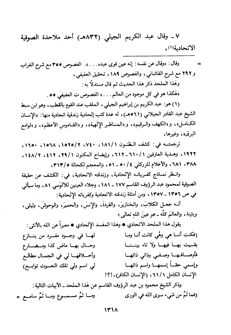 7 - وقال عبد الكريم الجيلي (832هـ) أحد ملاحدة الصوفية الاتحادية