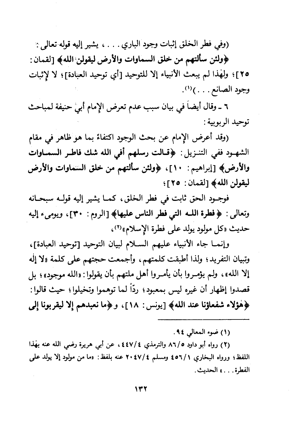 (وقد أعرض الإمام عن بحث الوجود اكتفاءً بما هو ظاهر في مقام الشهود ففي التنزيل: {قَالَتْ رُسُلُهُمْ أَفِي اللَّهِ شَكٌّ فَاطِرِ السَّمَاوَاتِ وَالْأَرْضِ} [إبراهيم: 10] ، {وَلَئِنْ سَأَلْتَهُمْ مَنْ خَلَقَ السَّمَاوَاتِ وَالْأَرْضَ لَيَقُولُنَّ اللَّهُ} [لقمان: 25] ؛ فوجود الحق ثابت في فطر الخلق، كما يشير إليه قوله سبحانه وتعالى: {فِطْرَةَ اللَّهِ الَّتِي فَطَرَ النَّاسَ عَلَيْهَا} [الروم: 30] ويومئ إليه حديث «كل مولود يولد على فطرة الإسلام» ، وإنما جاء الأنبياء عليهم السلام لبيان التوحيد [توحيد العبادة] ، وتبيان التفريد؛ ولذا أطبقت كلمتهم، وأجمعت حجتهم على كلمة ((لا إله إلا الله)) ، ولم يؤمروا بأن يأمروا أهل ملتهم بأن يقولوا: ((الله موجود)) ؛ بل قصدوا إظهار أن غيره ليس بمعبود؛ ردا لما توهموا وتخيلوا؛ حيث قالوا: {هَؤُلَاءِ شُفَعَاؤُنَا عِنْدَ اللَّهِ} [يونس: 18] ، و {مَا نَعْبُدُهُمْ إِلَّا لِيُقَرِّبُونَا إِلَى اللَّهِ زُلْفَى}