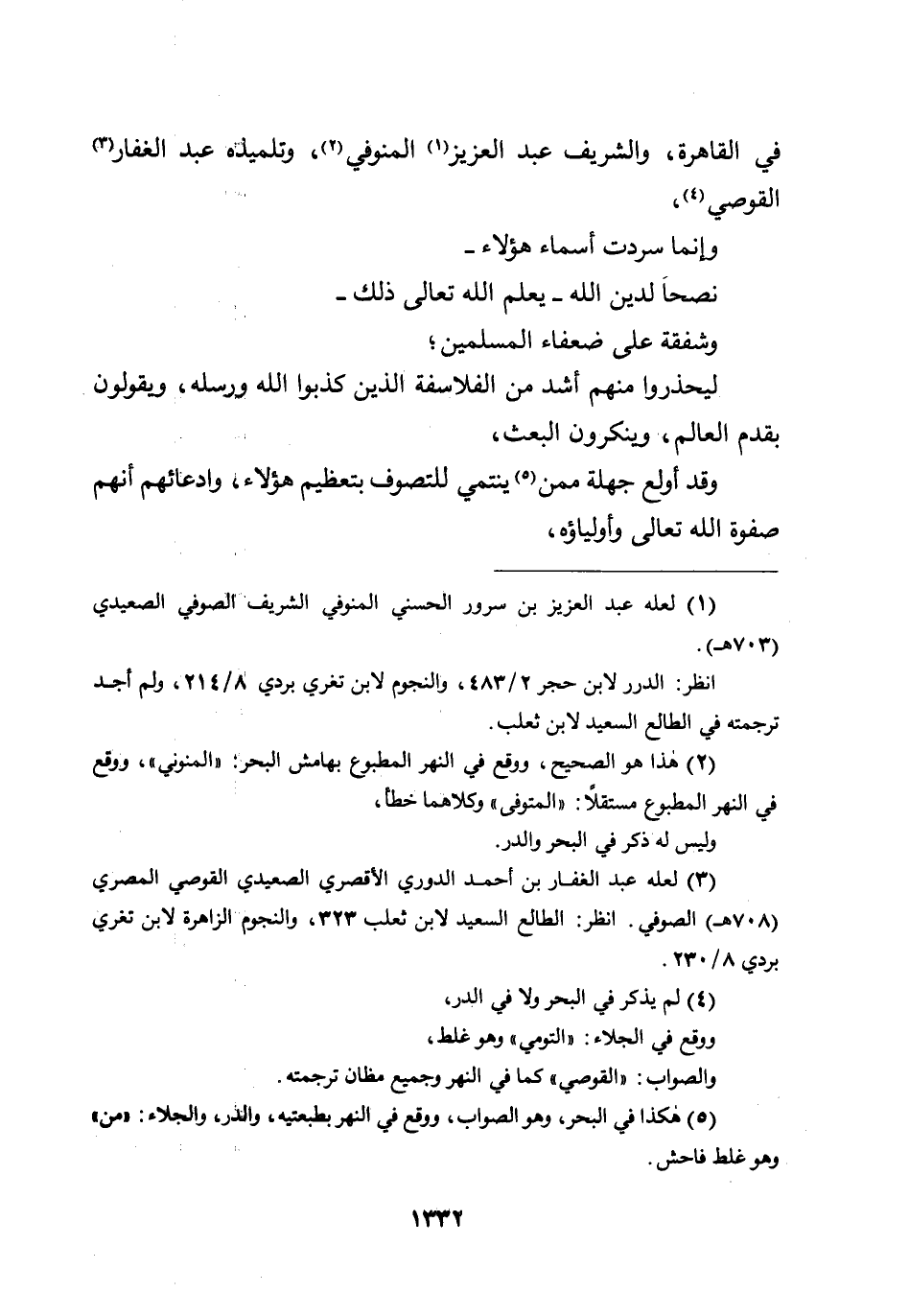 وإنما سردت أسماء هؤلاء - نصحاً لدين الله - يعلم الله تعالى ذلك - وشفقة على ضعفاء المسلمين؛ ليحذروا منهم أشد من الفلاسفة الذين كذبوا الله ورسله، ويقولون بقدم العالم، وينكرون البعث.
