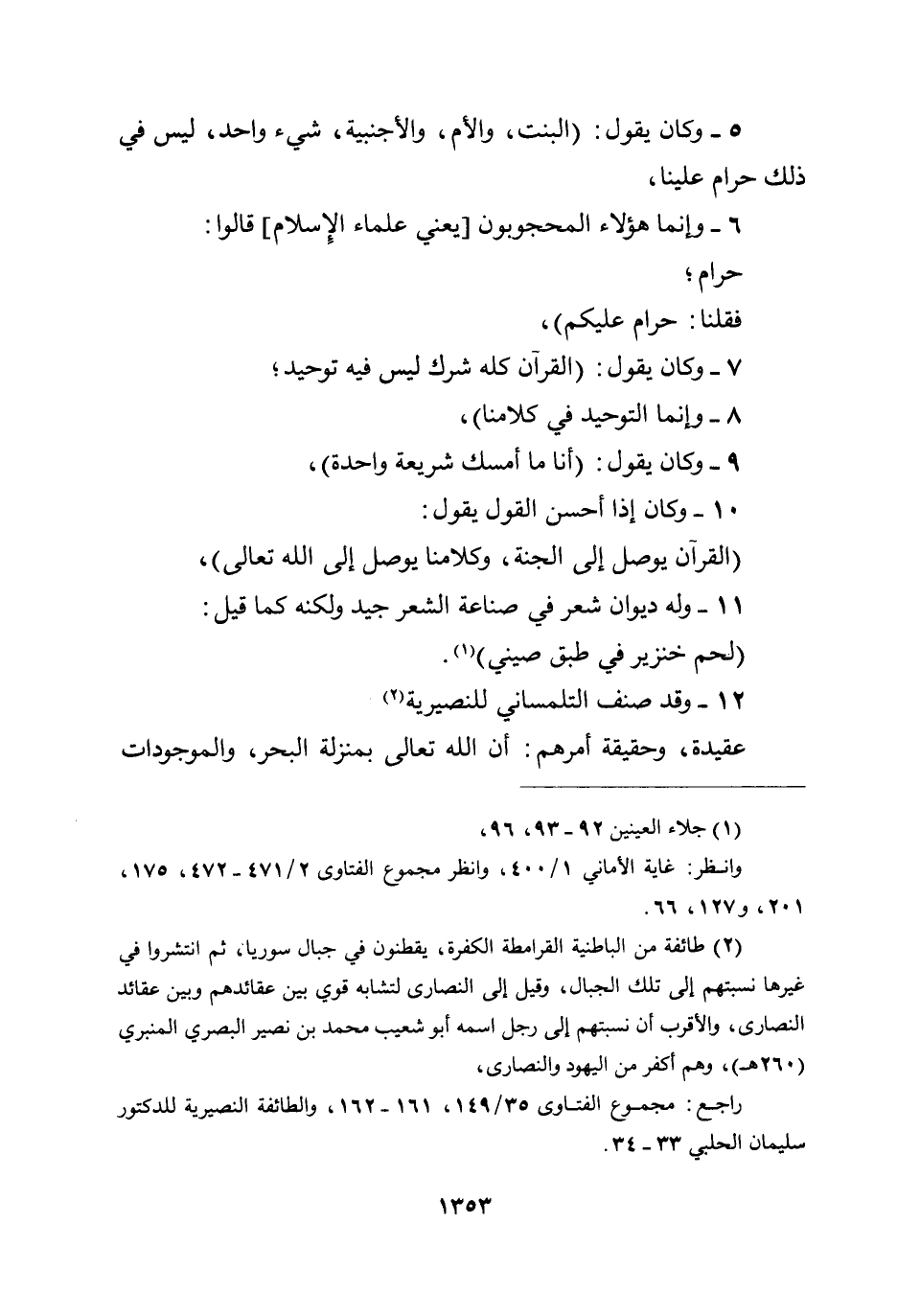 12 - وقد صنف التلمساني للنصيرية عقيدة، وحقيقة أمرهم: أن الله تعالى بمنزلة البحر، والموجودات