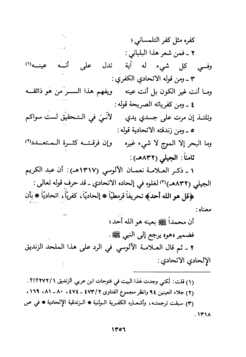 1 - ذكر العلامة نعمان الآلوسي (1317هـ) : أن عبد الكريم الجيلي (832هـ) لغلوه في إلحاده الاتحادي - قد حرف قوله تعالى: