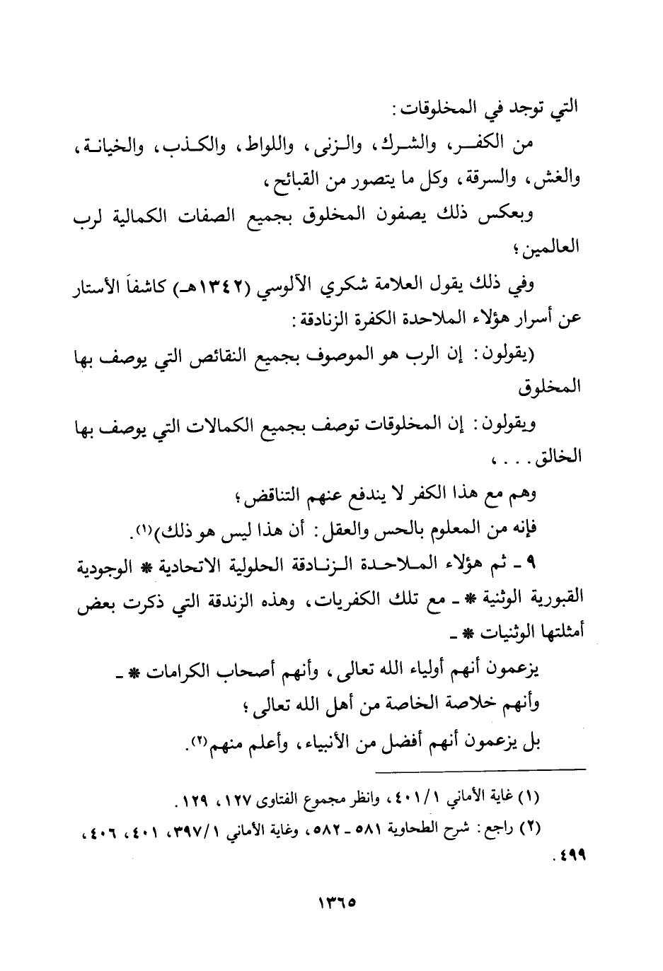 التي توجد في المخلوقات: من الكفر، والشرك، والزنى، واللواط، والكذب، والخيانة، والغش، والسرقة، وكل ما يتصور من القبائح، وبعكس ذلك يصفون المخلوق بجميع الصفات الكمالية لرب العالمين؛ وفي ذلك يقول العلامة شكري الآلوسي (1342هـ) كاشفاً الأستار عن أسرار هؤلاء الملاحدة الكفرة الزنادقة: