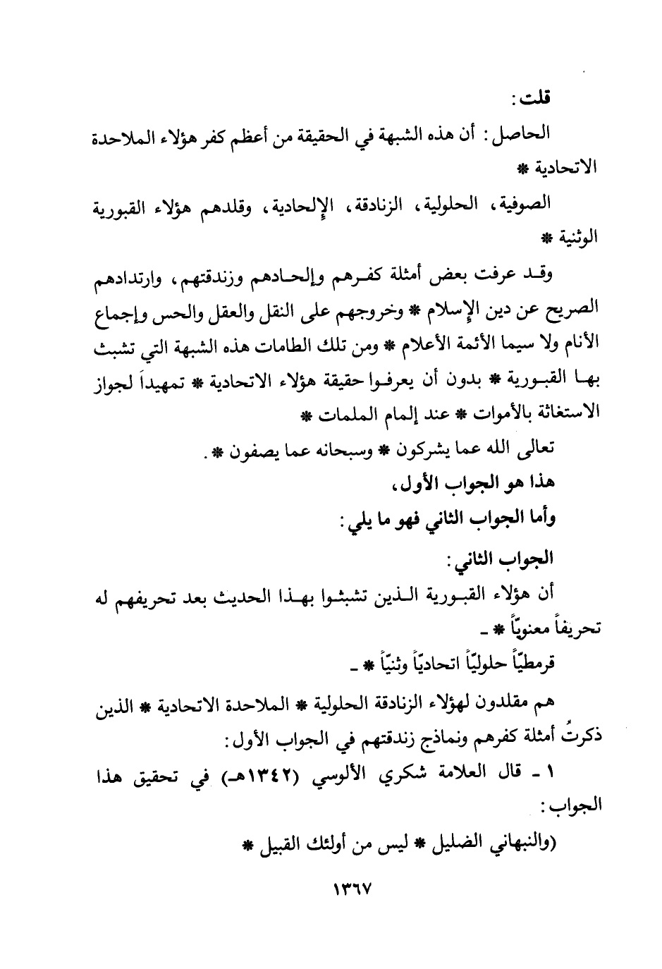الحاصل: أن هذه الشبهة في الحقيقة من أعظم كفر هؤلاء الملاحدة الاتحادية * الصوفية، الحلولية، الزنادقة، الإلحادية، وقلدهم هؤلاء القبورية الوثنية * وقد عرفت بعض أمثلة كفرهم وإلحادهم وزندقتهم، وارتدادهم الصريح عن دين الإسلام * وخروجهم على النقل والعقل والحس وإجماع الأنام، ولا سيما الأئمة الأعلام *.