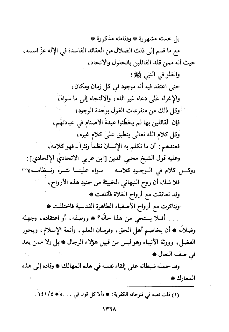 بل خسته مشهورة * ودناءته مذكورة * مع ما ضم إلى ذلك الضلال من العقائد الفاسدة في الإله عز اسمه، حيث أنه ممن قلد القائلين بالحلول والاتحاد، والغلو في النبي صلى الله عليه وسلم؛ حتى اعتقد فيه أنه موجود في كل زمان ومكان، والإغراء على دعاء غير الله , والالتجاء إلى ما سواه، وكل ذلك من متفرعات القول بوحدة الوجود؛ فإن القائلين بها لم يخطئوا عبدة الأصنام في عبادتهم، وكل كلام الله تعالى ينطبق على كلام غيره، فعندهم: أن ما تكلم به الإنسان نظماً ونثراً - فهو كلامه، وعليه قول الشيخ محيي الدين [ابن عربي الاتحادي الإلحادي] :