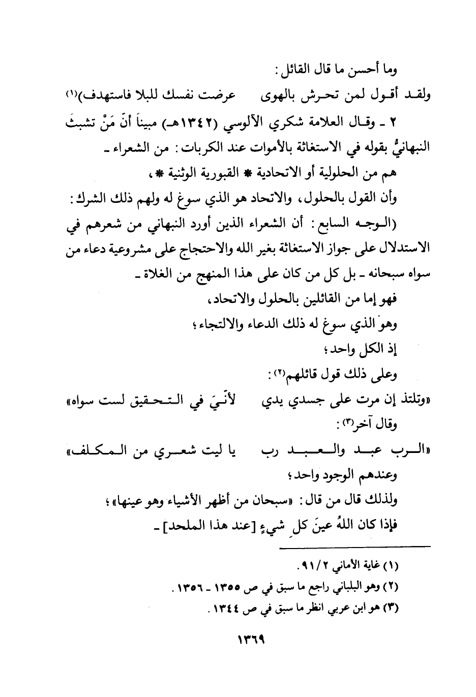 2 - وقال العلامة شكري الآلوسي (1342هـ) مبيناً أن من تشبث النبهاني بقوله في الاستغاثة بالأموات عند الكربات: من الشعراء - هم من الحلولية أو الاتحادية * القبورية الوثنية * وأن القول بالحلول والاتحاد هو الذي سوغ له ولهم ذلك الشرك.
