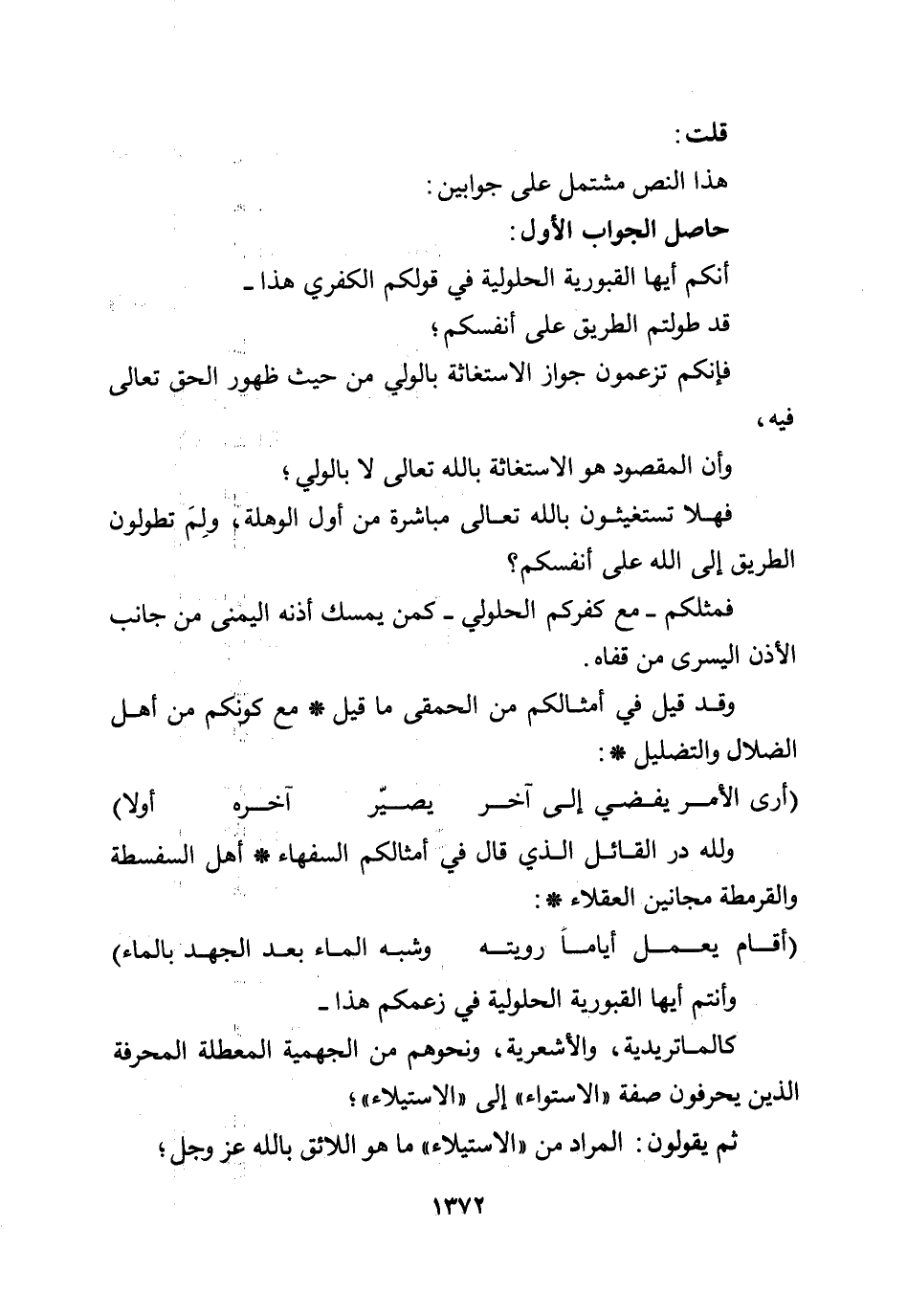 أنكم أيها القبورية الحلولية في قولكم الكفري هذا - قد طولتم الطريق على أنفسكم؛ فإنكم تزعمون جواز الاستغاثة بالولي من حيث ظهور الحق تعالى فيه، وأن المقصود هو الاستغاثة بالله تعالى لا بالولي؛ فهلا تستغيثون بالله تعالى مباشرة من أول الوهلة، ولم تطولون الطريق إلى الله على أنفسكم؟ .