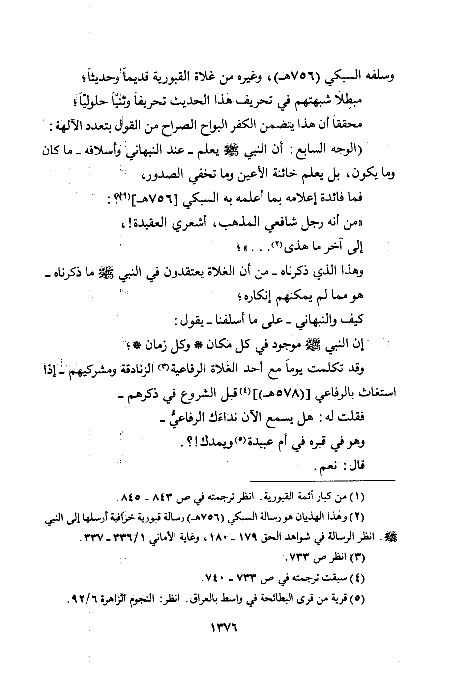 ((من أنه رجل شافعي المذهب، أشعري العقيدة! إلى آخر ما هذى....)) ؛ وهذا الذي ذكرناه - من أن الغلاة يعتقدون في النبي صلى الله عليه وسلم ما ذكرناه - هو مما لم يمكنهم إنكاره؛ كيف والنبهاني - على ما أسلفنا - يقول: إن النبي صلى الله عليه وسلم موجود في كل مكان * وكل زمان * وقد تكلمت يوماً مع أحد الغلاة الرفاعية الزنادقة ومشركيهم - إذا استغاث بالرفاعي (578هـ) قبل الشروع في ذكرهم - فقلت له: هل يسمع الآن نداءك الرفاعي - وهو في قبره في أم عبيدة ويمدك؟ قال: نعم.