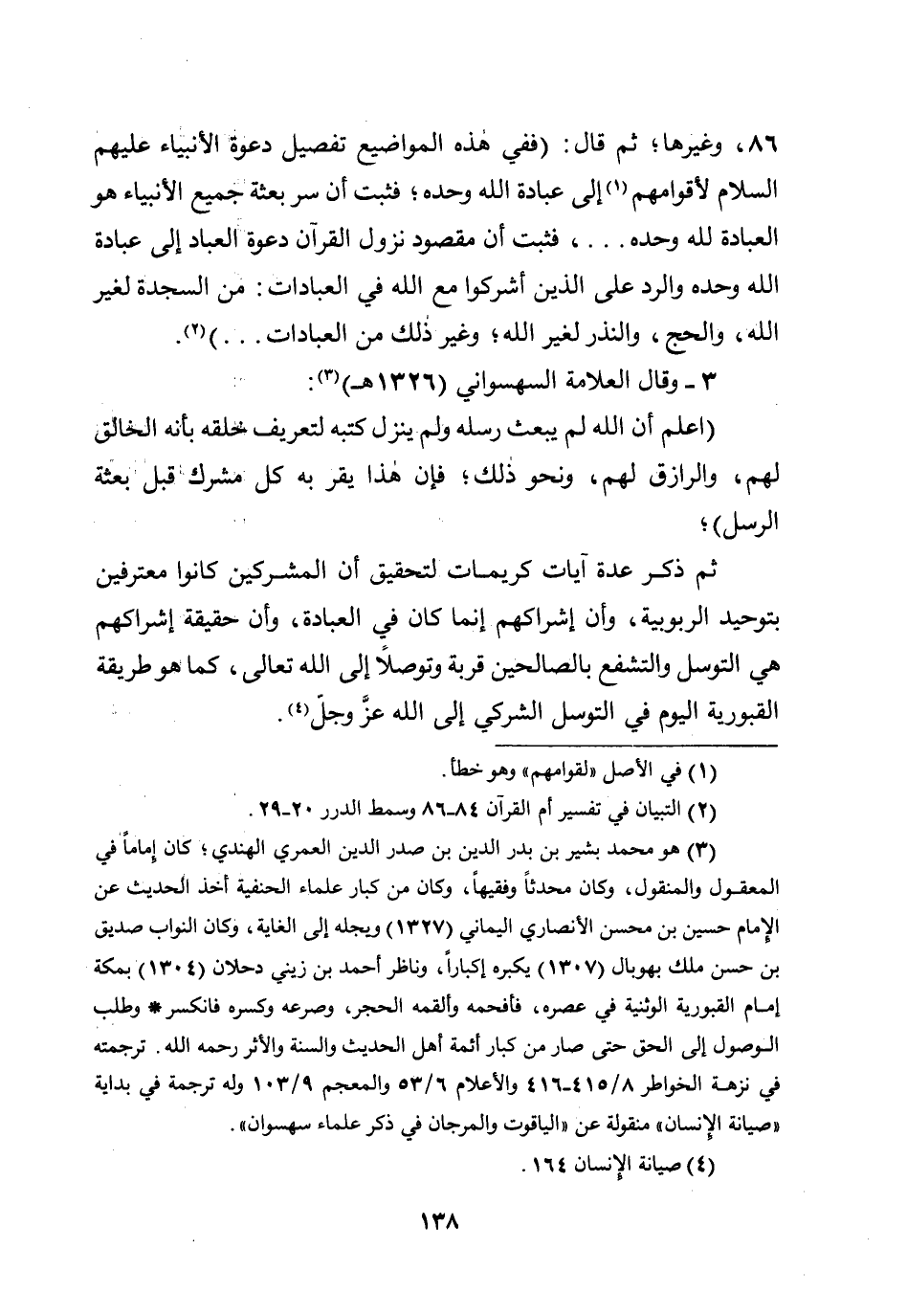 86، وغيرها؛ ثم قال: (ففي هذه المواضيع تفصيل دعوة الأنبياء عليهم السلام لأقوامهم إلى عبادة الله وحده؛ فثبت أن سر بعثة جميع الأنبياء هو العبادة لله وحده....، فثبت أن مقصود نزول القرآن دعوة العباد إلى عبادة الله وحده والرد على الذين أشركوا مع الله في العبادات: من السجدة لغير الله، والحج، والنذر لغير الله؛ وغير ذلك من العبادات ... ) .