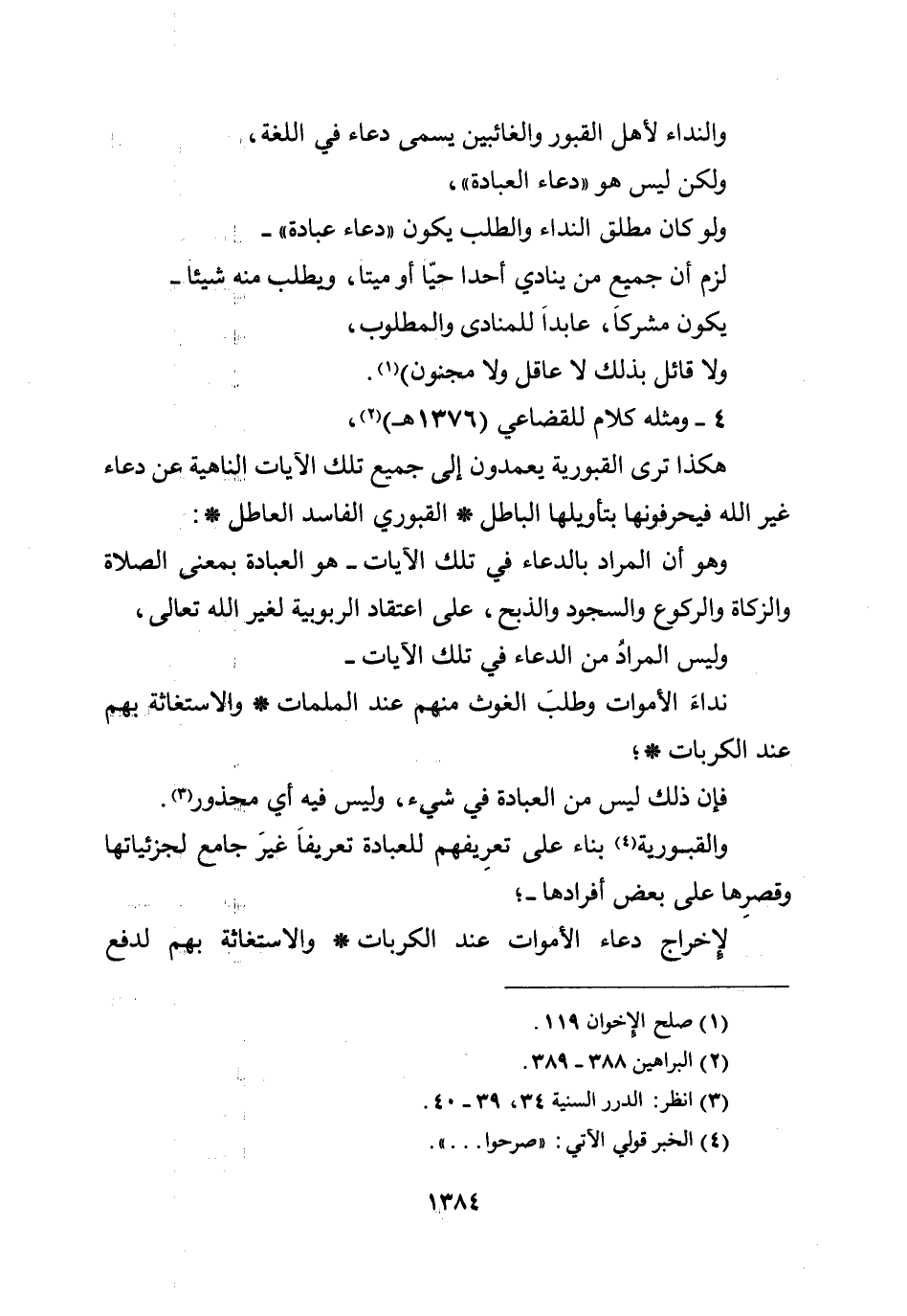 والنداء لأهل القبور والغائبين يسمى دعاء في اللغة، ولكن ليس هو ((دعاء العبادة)) ، ولو كان مطلق النداء والطلب يكون ((دعاء عبادة)) - لزم أن جميع من ينادي أحداً حياً أو ميتاً، ويطلب منه شيئاً - يكون مشركاً، عابداً للمنادى والمطلوب، ولا قائل بذلك لا عاقل ولا مجنون) .