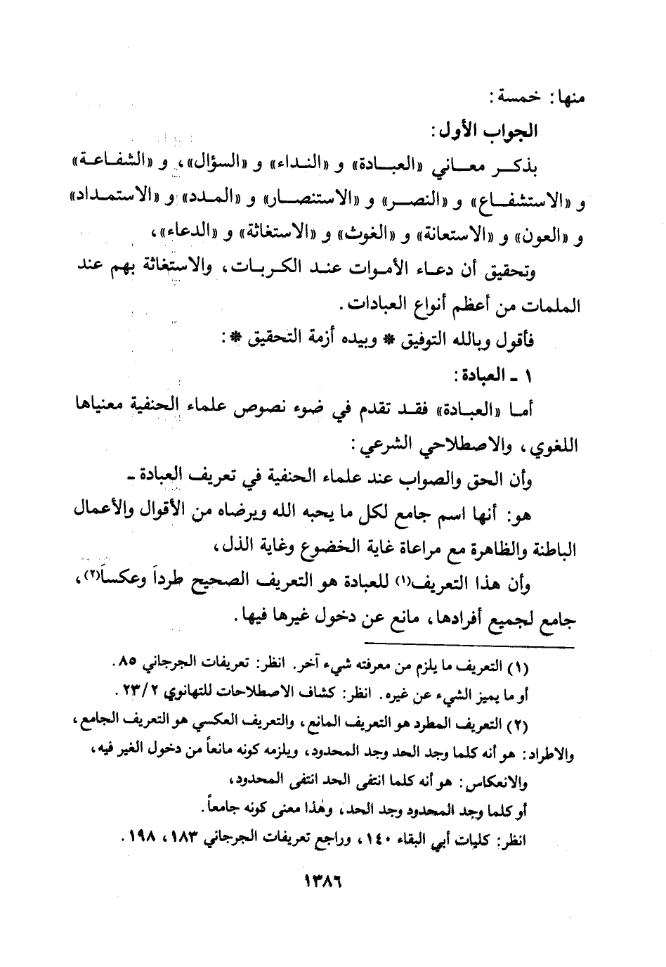 أما ((العبادة)) فقد تقدم في ضوء علماء الحنفية معنياها اللغوي، والاصطلاحي الشرعي، وأن الحق والصواب عند علماء الحنفية في تعريف العبادة - هو: أنها اسم جامع لكل ما يحبه الله ويرضاه من الأقوال والأعمال الباطنة والظاهرة، مع مراعاة غاية الخضوع وغاية الذل، وأن هذا التعريف للعبادة هو التعريف الصحيح طرداً وعكساً، جامع لجميع أفرادها، مانع عن دخول غيرها فيها.