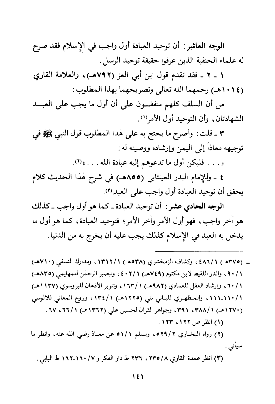 الوجه العاشر: أن توحيد العبادة أول واجب في الإسلام فقد صرح له علماء الحنفية الذين عرفوا حقيقة توحيد الرسل.