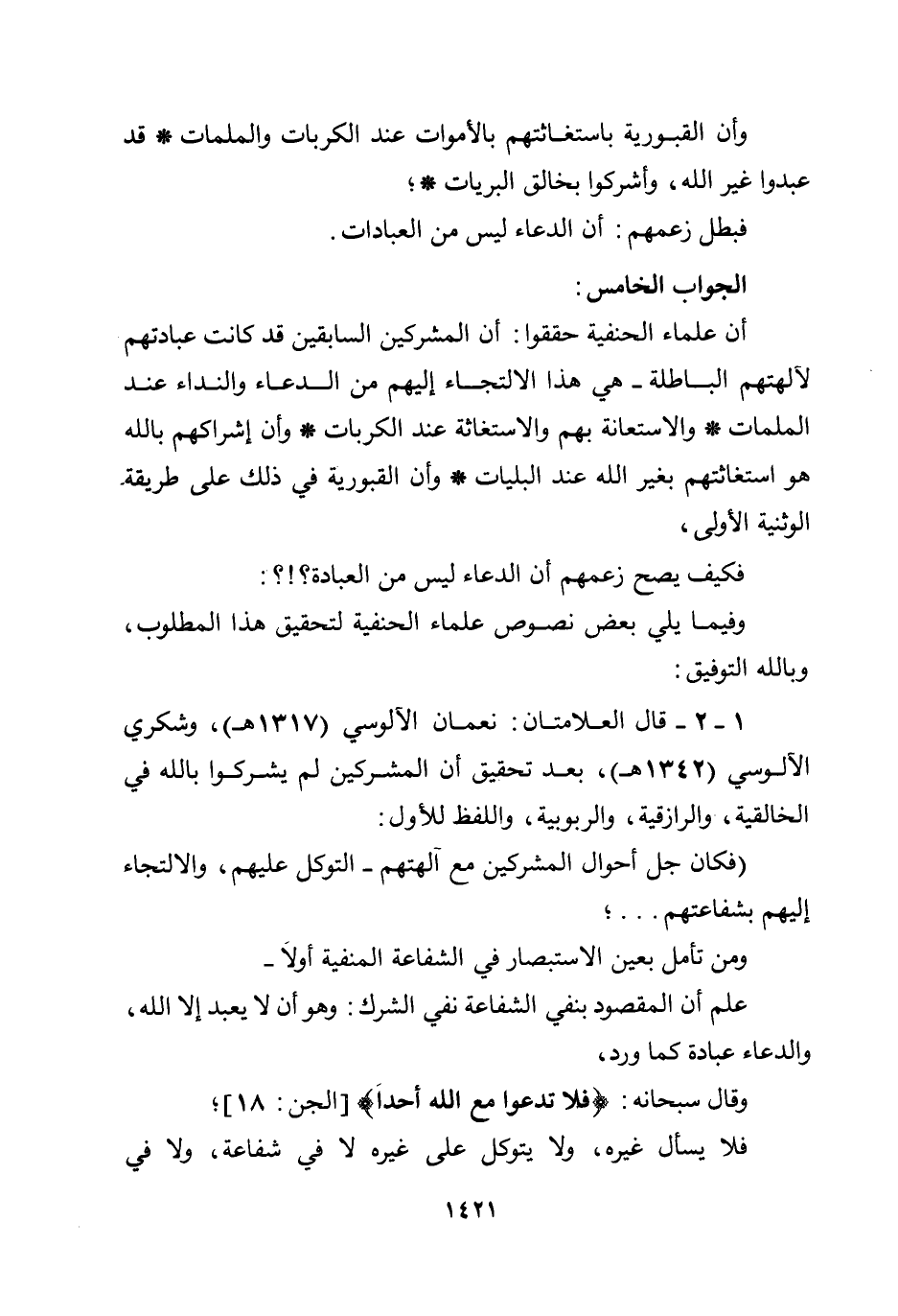 أن علماء الحنفية حققوا: أن المشركين السابقين قد كانت عبادتهم لآلهتهم الباطلة - هي هذا الالتجاء إليهم، من الدعاء والنداء عند الملمات * والاستعانة بهم والاستغاثة عند الكربات * وأن إشراكهم بالله هو استغاثتهم بغير الله عند البليات * وأن القبورية في ذلك على طريقة الوثنية الأولى، فكيف يصح زعمهم أن الدعاء ليس من العبادة؟ .