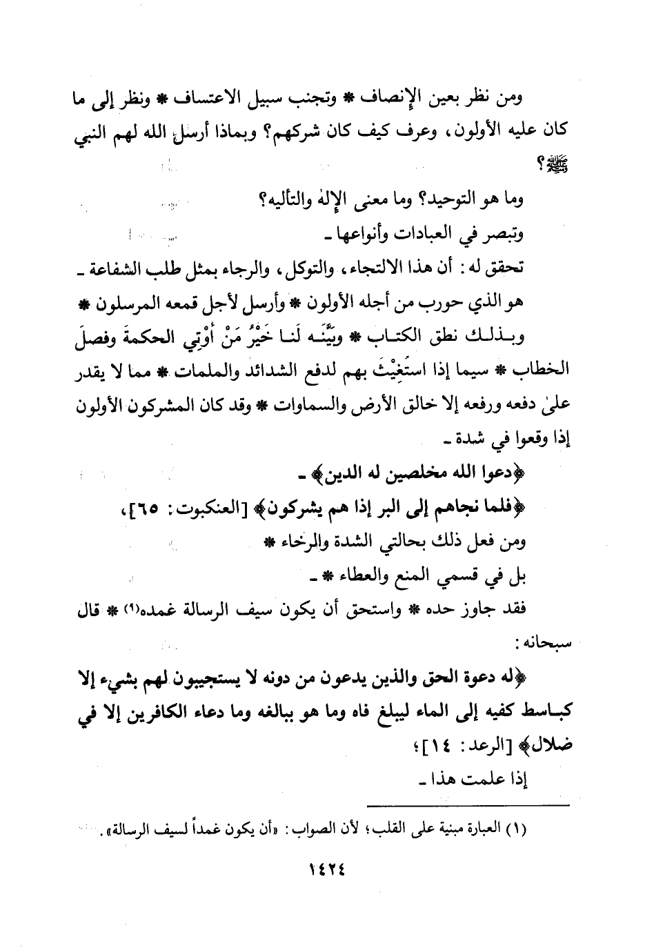 ومن نظر بعين الإنصاف * وتجنب سبيل الاعتساف * ونظر إلى ما كان عليه الأولون، وعرف كيف كان شركهم؟ وبماذا أرسل الله لهم النبي صلى الله عليه وسلم؟ وما هو التوحيد؟ وما معنى الإله والتأليه؟ وتبصر في العبادات وأنواعها - تحقق له: أن هذا الالتجاء والتوكل والرجاء، بمثل طلب الشفاعة - هو الذي حورب من أجله الأولون * وأرسل لأجل قمعه المرسلون * وبذلك نطق الكتاب * وبينه لنا خير من أوتي الحكمة وفصل الخطاب * سيما إذا استغيث بهم لدفع الشدائد والملمات * مما لا يقدر على دفعه ورفعه إلا خالق الأرض والسماوات * وقد كان المشركون الأولون إذا وقعوا في شدة - {دَعَوُا اللَّهَ مُخْلِصِينَ لَهُ الدِّينَ فَلَمَّا نَجَّاهُمْ إِلَى الْبَرِّ إِذَا هُمْ يُشْرِكُونَ} [العنكبوت: 65] ، ومن فعل ذلك بحالتي الشدة والرخاء * بل في قسمي المنع والعطاء * - فقد جاوز حده * واستحق أن يكون سيف الرسالة غمده * قال سبحانه: