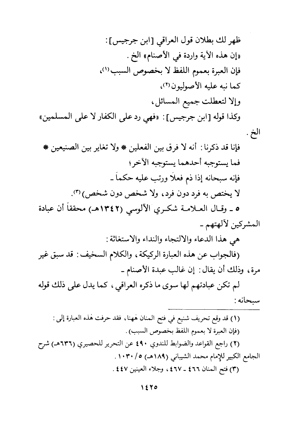 5 - وقال العلامة شكري الآلوسي (1342هـ) محققاً أن عبادة المشركين لآلهتهم - هي هذا الدعاء والالتجاء والنداء والاستغاثة: