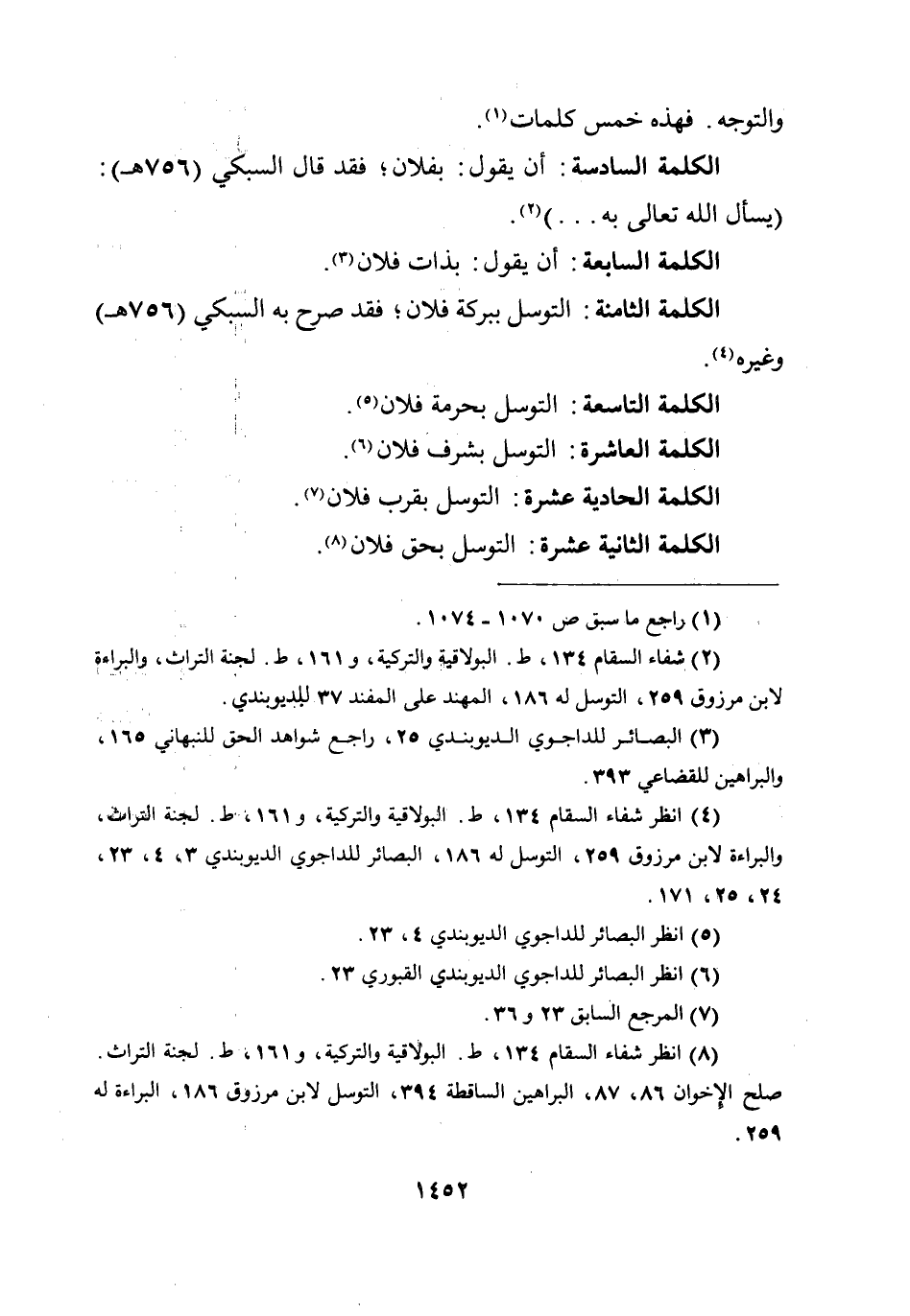 الكلمة الثامنة: التوسل ببركة فلان؛ فقد صرح به السبكي (756هـ) وغيره.