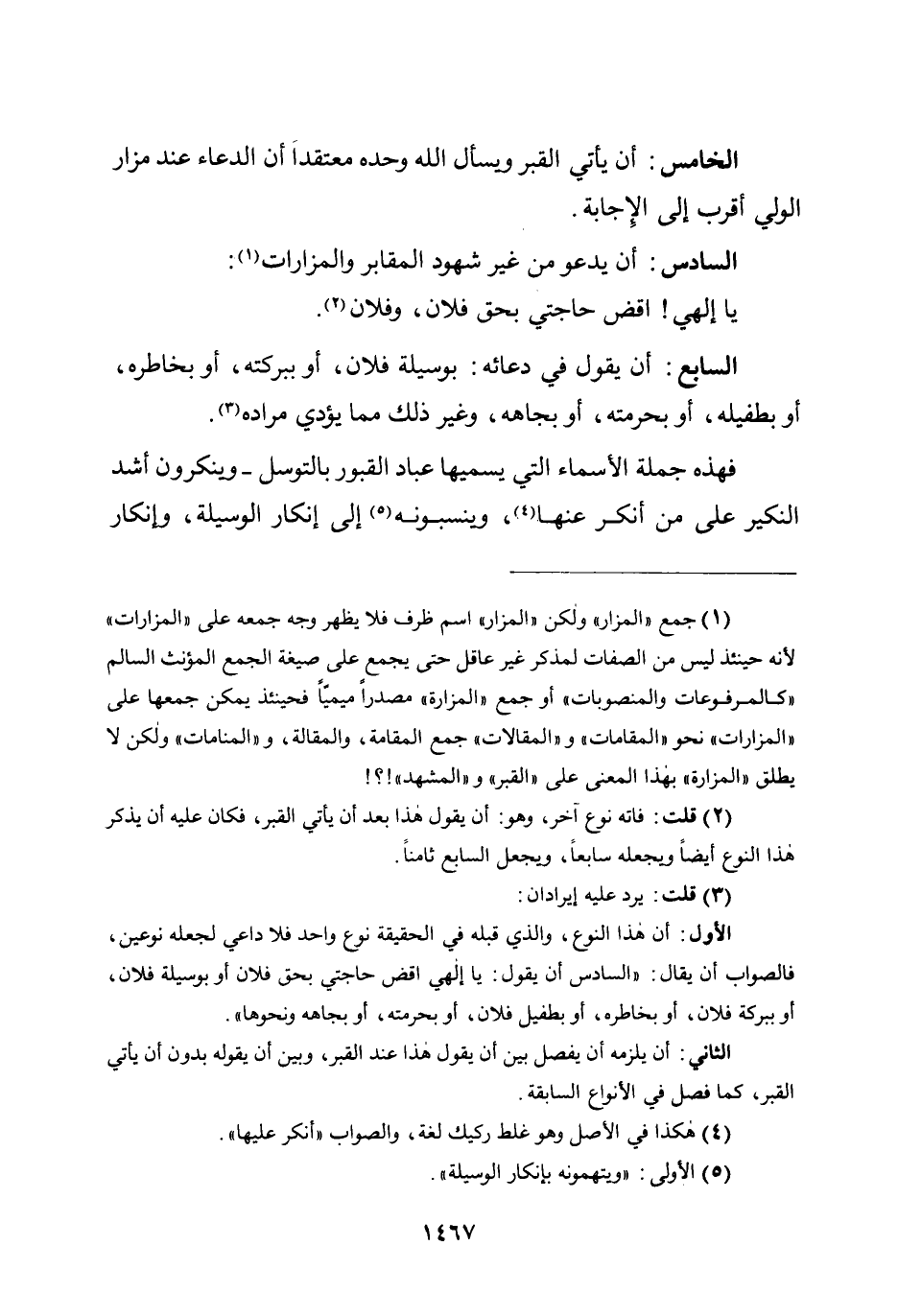 الخامس: أن يأتي القبر ويسأل الله وحده معتقداً أن الدعاء عند مزار الولي أقرب إلى الإجابة.