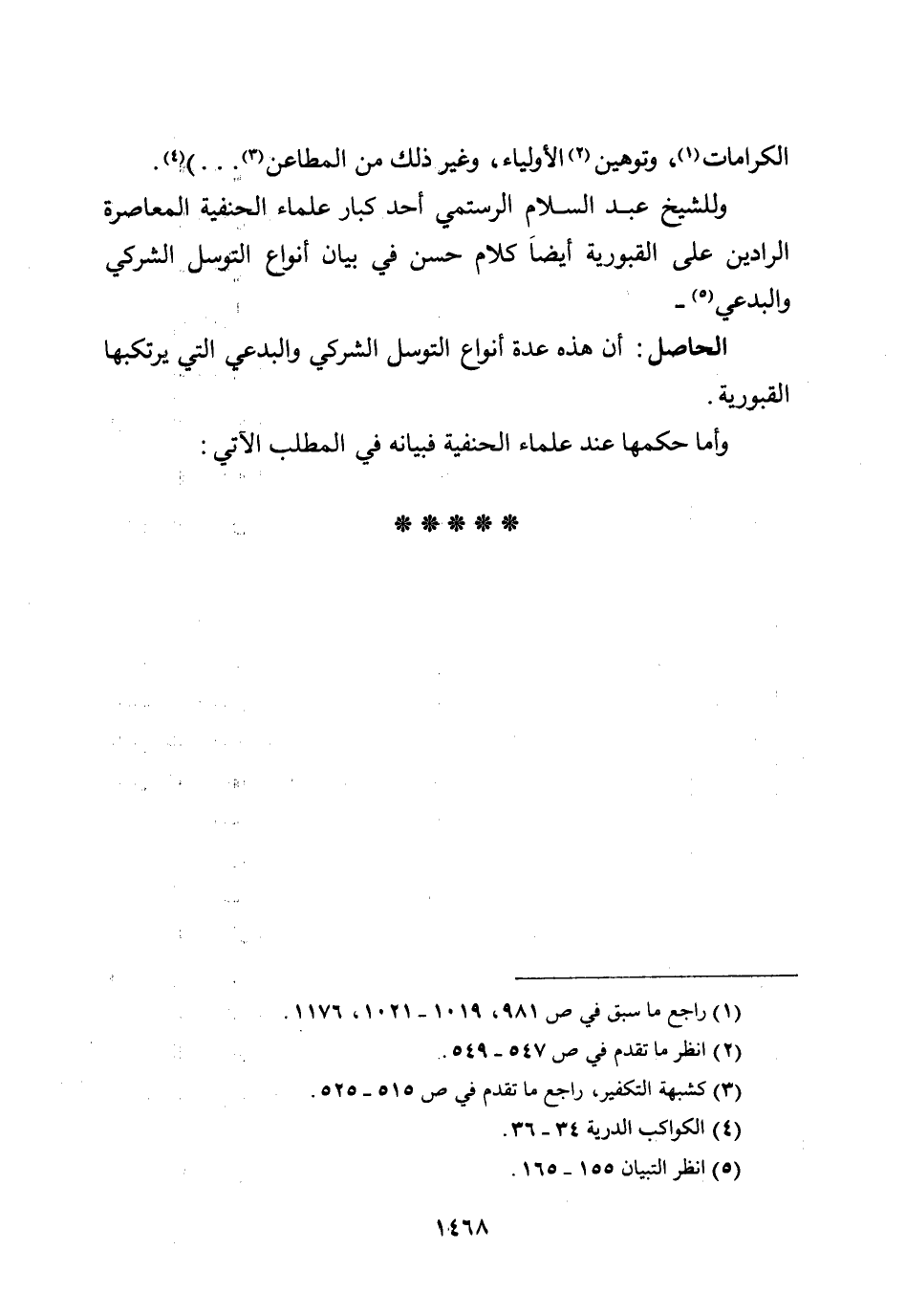 وللشيخ عبد السلام الرستمي أحد كبار علماء الحنفية المعاصرة الرادين على القبورية أيضاً كلام حسن في بيان أنواع التوسل الشركي والبدعي -.