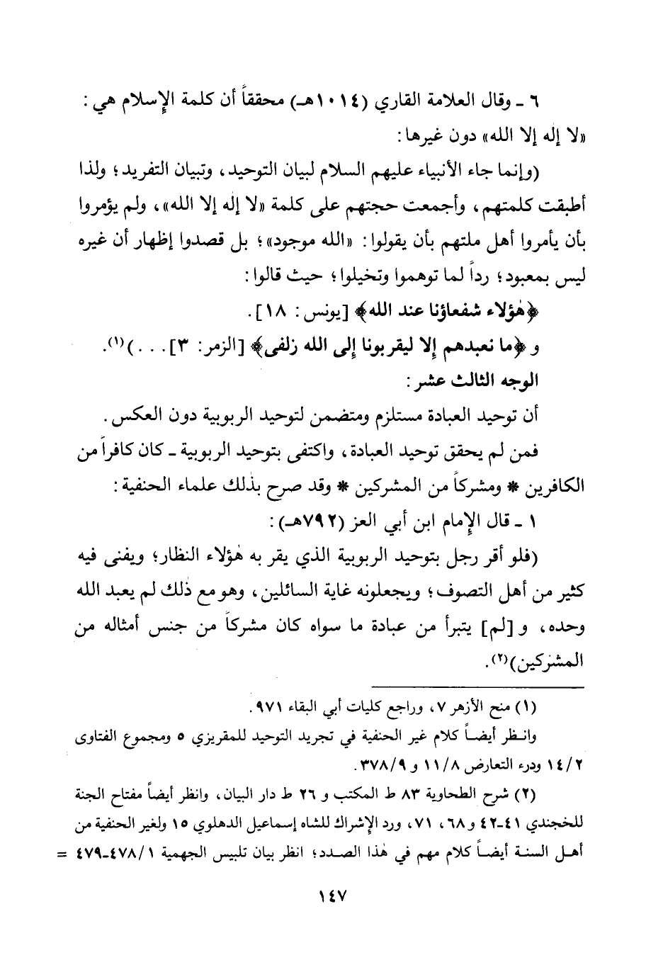 6 - وقال العلامة القاري (1014هـ) محققًا أن كلمة الإسلام هي: ((لا إله إلا الله)) دون غيرها: