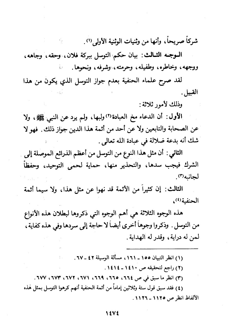 الثالث: إن كثيراً من الأئمة قد نهوا عن مثل هذا، ولا سيما أئمة الحنفية، هذه الوجوه الثلاثة هي أهم الوجوه التي ذكروها لبطلان هذه الأنواع من التوسل. وذكروا وجوهاً أخرى أيضاً لا حاجة إلى سردها، وفي هذه كفاية، لمن له دراية، وقدر له الهداية.