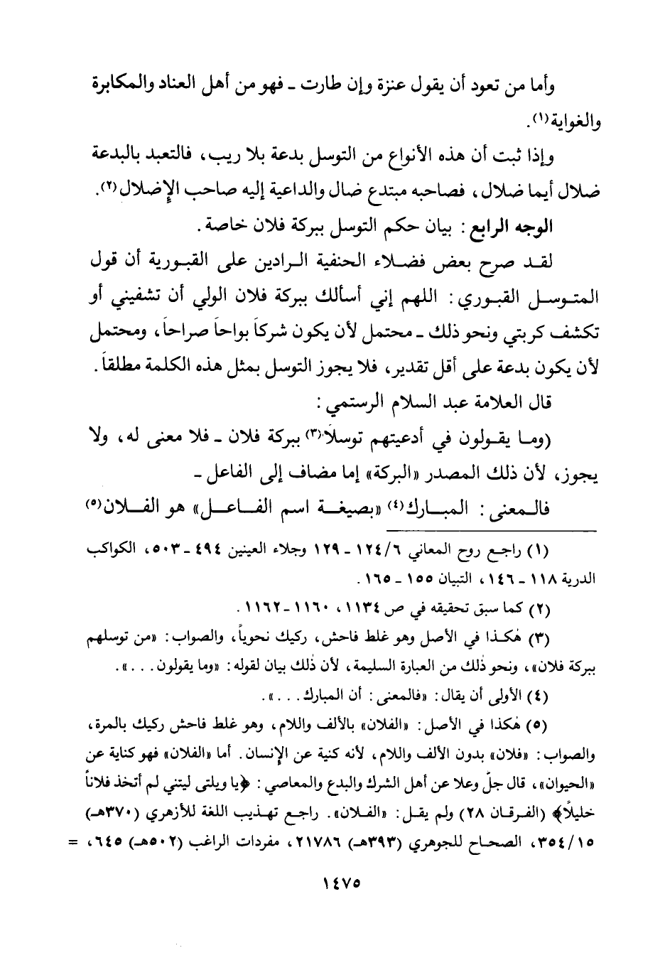 (وما يقولون في أدعيتهم توسلاً ببركة فلان - فلا معنى له، ولا يجوز، لأن ذلك المصدر ((البركة)) إما مضاف إلى الفاعل - فالمعنى: المبارك ((بصيغة اسم الفاعل)) هو الفلان