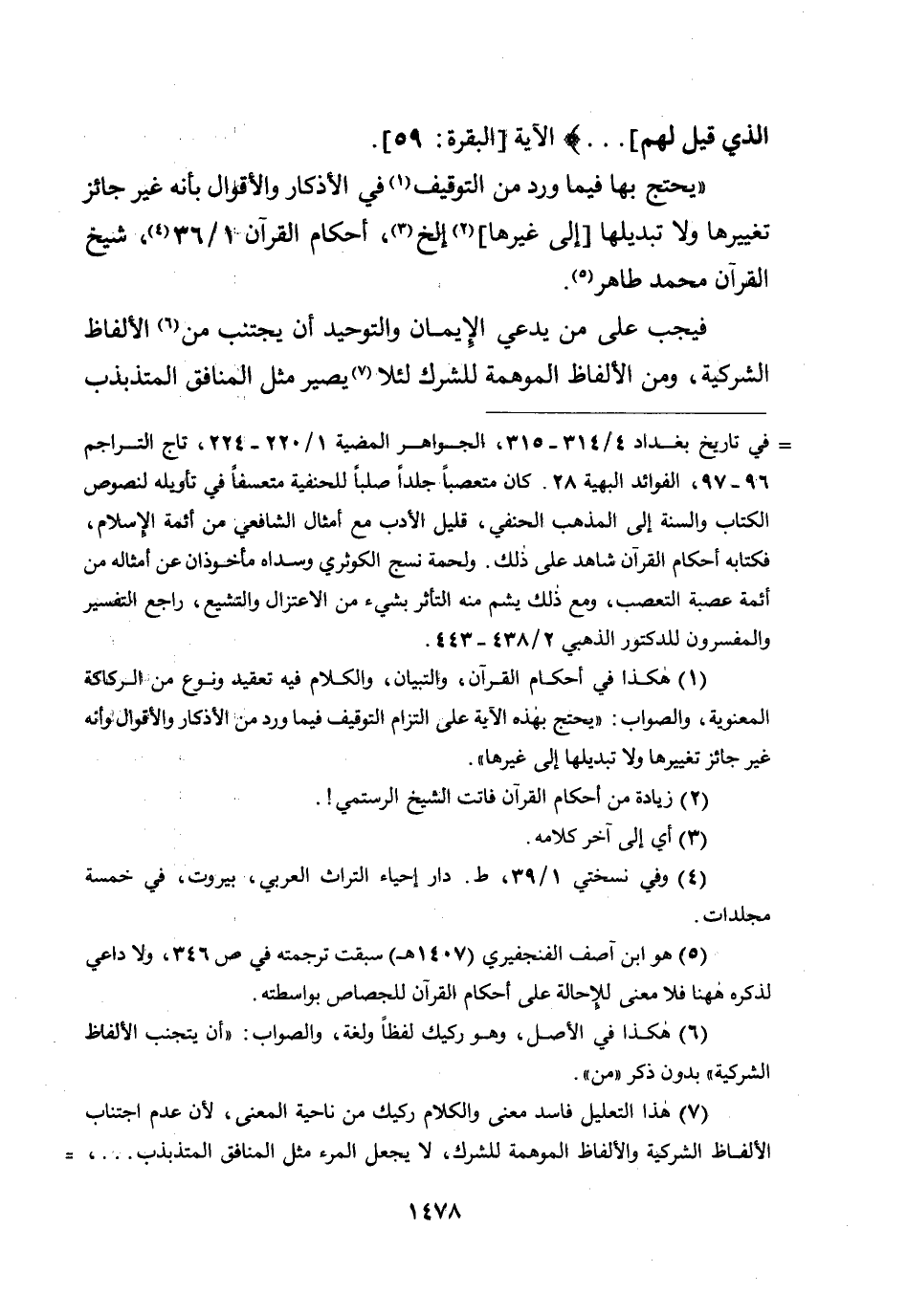 ((يحتج بها فيما ورد من التوقيف في الأذكار والأقوال بأنه غير جائز تغييرها ولا تبديلها [إلى غيرها] إلخ، أحكام القرآن 1\36، شيخ القرآن محمد طاهر.