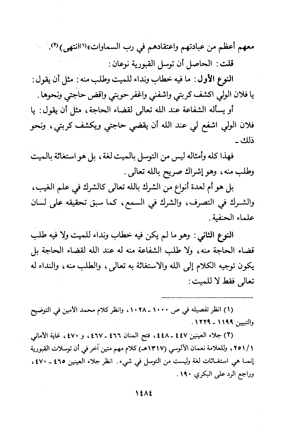 النوع الثاني: وهو ما لم يكن فيه خطاب ونداء للميت ولا فيه طلب قضاء الحاجة منه، ولا طلب الشفاعة منه له عند الله لقضاء الحاجة، بل يكون توجيه الكلام إلى الله والاستغاثة به تعالى، والطلب منه، والنداء له تعالى فقط لا للميت: