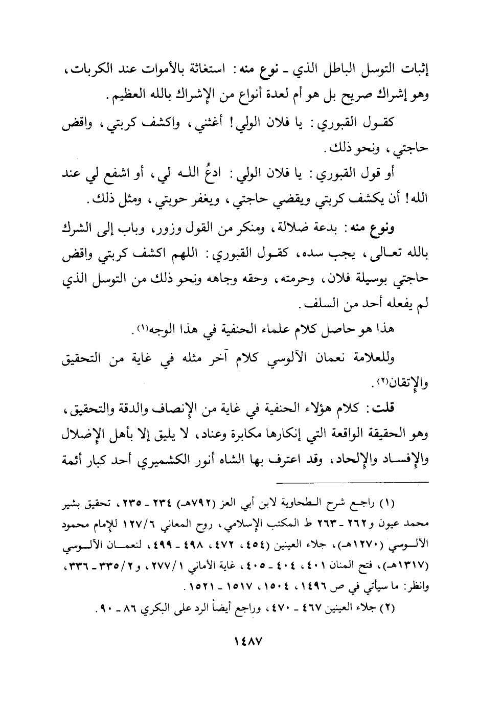 ونوع منه: بدعة ضلالة، ومنكر من القول وزور، وباب إلى الشرك بالله تعالى، يجب سده، كقول القبوري: اللهم اكشف كربتي واقض حاجتي بوسيلة فلان، وحرمته، وحقه وجاهه، ونحو ذلك من التوسل الذي لم يفعله أحد من السلف.