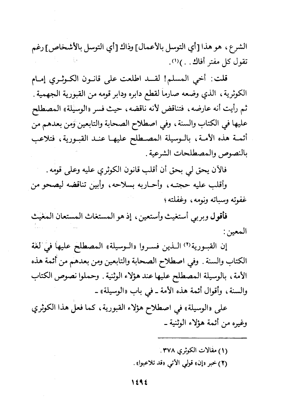 فالآن يحق لي بحق أن أقلب قانون الكوثري عليه وعلى قومه. وأقلب عليه حجته، وأحاربه بسلاحه، وأبين تناقضه ليصحو من غفوته وسباته ونومه وغفلته؛ فأقول وبربي أستغيث وأستعين، إذ هو المستغاث المستعان المغيث المعين: