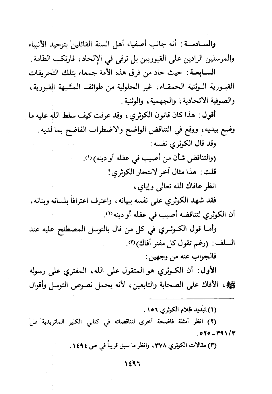 الأول: أن الكوثري هو المتقول على الله، المفتري على رسوله صلى الله عليه وسلم، الأفاك على الصحابة والتابعين، لأنه يحمل نصوص التوسل وأقوال