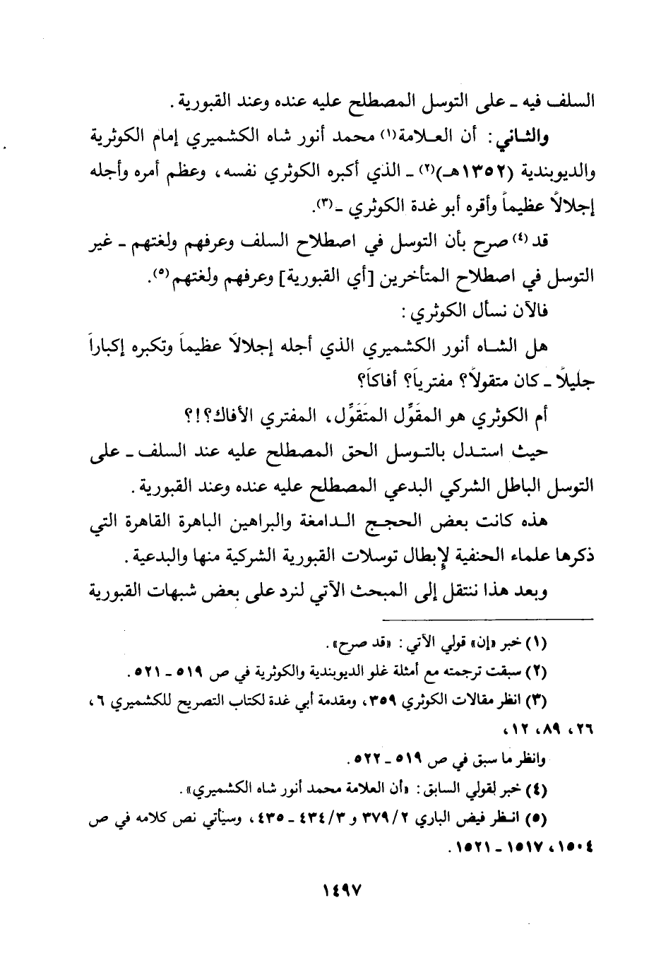 والثاني: أن العلامة محمد أنور شاه الكشميري، إمام الكوثرية والديوبندية (1352هـ) - الذي أكبره الكوثري نفسه، وعظم أمره وأجله إجلالاً عظيماً وأقره أبو غدة الكوثري - قد صرح بأن التوسل في اصطلاح السلف وعرفهم ولغتهم - غير التوسل في اصطلاح المتأخرين [أي القبورية] وعرفهم ولغتهم.