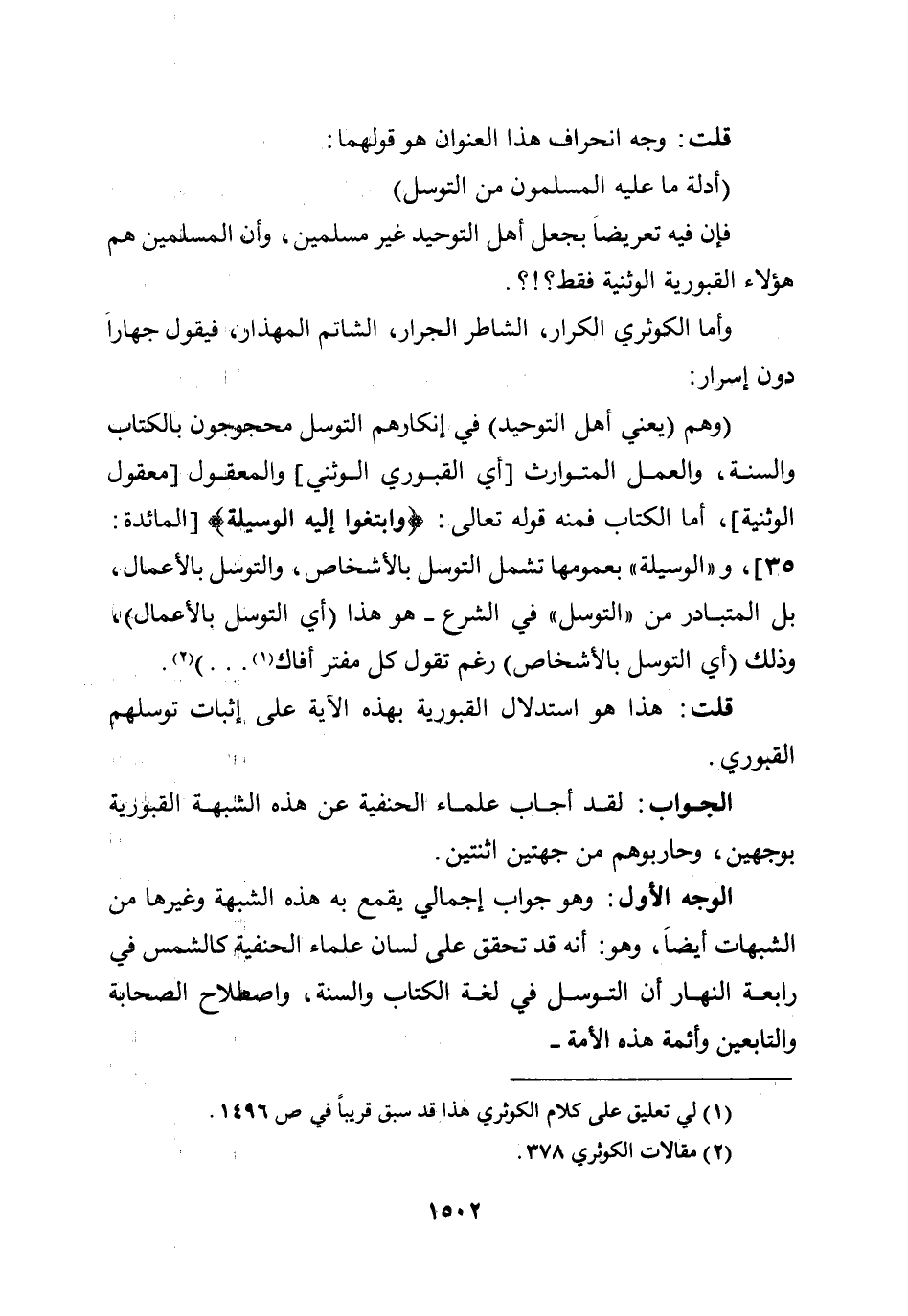 (وهم (يعني أهل التوحيد) في إنكارهم التوسل محجوجون بالكتاب والسنة، والعمل المتوارث [أي القبوري الوثني] والمعقول [معقول الوثنية] ، أما الكتاب فمنه قوله تعالى: {وَابْتَغُوا إِلَيْهِ الْوَسِيلَةَ} [المائدة: 35] ، و ((الوسيلة)) بعمومها تشمل التوسل بالأشخاص، والتوسل بالأعمال، بل المتبادر من ((التوسل)) في الشرع - هو هذا (أي التوسل بالأعمال) ، وذلك (أي التوسل بالأشخاص) رغم تقول كل مفتر أفاك ... ) .