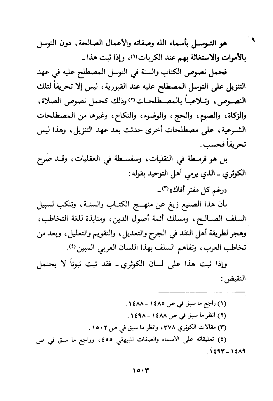 وإذا ثبت هذا - فحمل نصوص الكتاب والسنة في التوسل المصطلح عليه في عهد التنزيل على التوسل المصطلح عليه عند القبورية، ليس إلا تحريفاً لتلك النصوص، وتلاعباً بالمصطلحات، وذلك كحمل نصوص الصلاة، والزكاة، والصوم، والحج، والوضوء، والنكاح، وغيرها من المصطلحات الشرعية، على مصطلحات أخرى حدثت بعد عهد التنزيل، وهذا ليس تحريفاً فحسب، بل هو قرمطة في النقليات، وسفسطة في العقليات، وقد صرح الكوثري - الذي يرمي أهل التوحيد بقوله: ((رغم كل مفتر أفاك)) - بأن هذا الصنيع زيغ عن منهج الكتاب والسنة، وتنكب لسبيل السلف الصالح، ومسلك أئمة أصول الدين، ومنابذة للغة التخاطب، وهجر لطريقة أهل النقد في الجرح والتعديل، والتقويم والتعليل، وبعد من تخاطب العرب، وتفاهم السلف بهذا اللسان العربي المبين.
