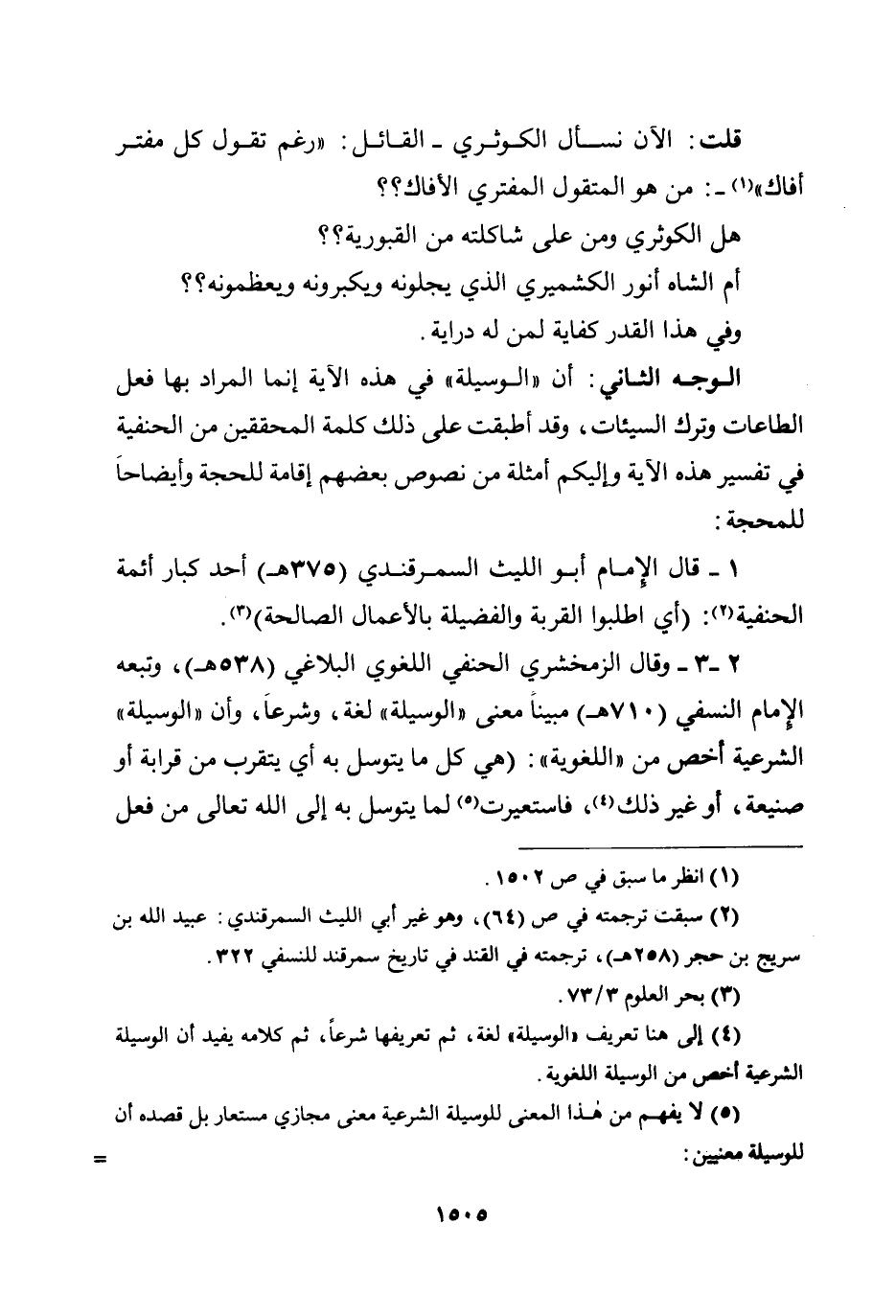 2 - 3- وقال الزمخشري الحنفي اللغوي البلاغي (538هـ) ، وتبعه الإمام النسفي (710هـ) مبيناً معنى ((الوسيلة)) لغة، وشرعاً، وأن ((الوسيلة)) الشرعية أخص من ((اللغوية)) : (هي كل ما يتوسل به - أي يتقرب - من قرابة أو صنيعة، أو غير ذلك، فاستعيرت لما يتوسل به إلى الله تعالى من فعل