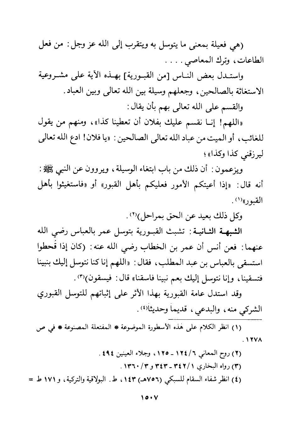 الشبهة الثانية: تشبث القبورية بتوسل عمر بالعباس رضي الله عنهما: فعن أنس أن عمر بن الخطاب رضي الله عنه: (كان إذا قحطوا استسقى بالعباس بن عبد المطلب، فقال: ((اللهم إنا كنا نتوسل إليك بنبينا فتسقينا، وإنا نتوسل إليك بعم نبينا فاسقنا)) قال: فيسقون) .