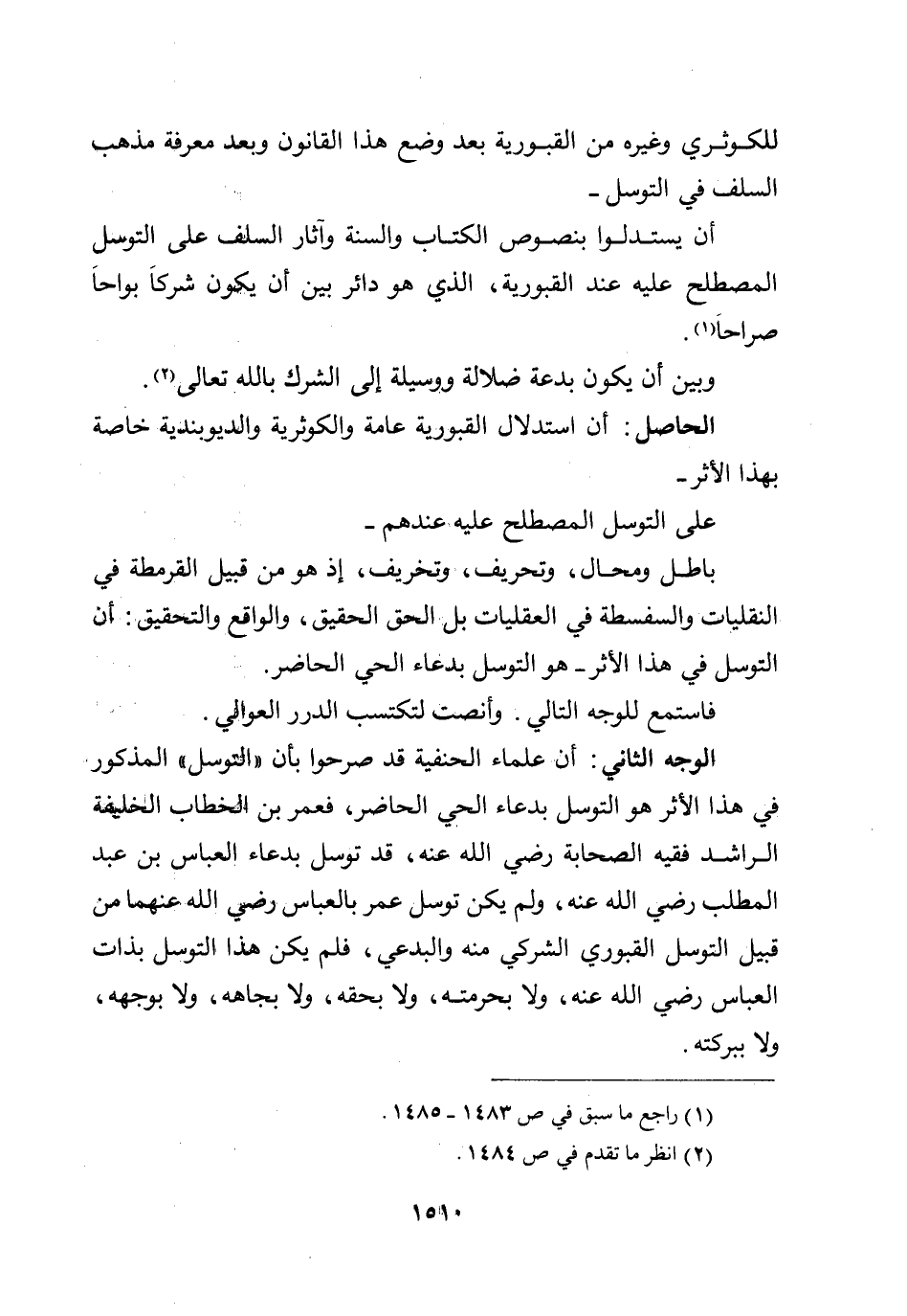 الوجه الثاني: أن علماء الحنفية قد صرحوا بأن ((التوسل)) المذكور في هذا الأثر هو التوسل بدعاء الحي الحاضر، فعمر بن الخطاب الخليفة الراشد فقيه الصحابة رضي الله عنه، قد توسل بدعاء العباس بن عبد المطلب رضي الله عنه، ولم يكن توسل عمر بالعباس رضي الله عنهما من قبيل التوسل القبوري الشركي منه والبدعي، فلم يكن هذا التوسل بذات العباس رضي الله عنه، ولا بحرمته، ولا بحقه، ولا بجاهه، ولا بوجهه، ولا ببركته.