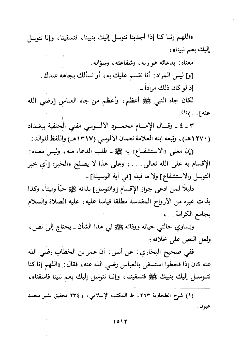 (إن معنى ((الاستشفاع)) به صلى الله عليه وسلم - طلب الدعاء منه، وليس معناه: الإقسام به على الله تعالى ... وعلى هذا لا يصلح ((الخبر)) [أي خبر التوسل والاستشفاع] ولا ما قبله [في آية الوسيلة]- دليلاً لمن ادعى جواز الإقسام [والتوسل] بذاته صلى الله عليه وسلم حياً وميتاً، وكذا بذات غيره من الأرواح المقدسة مطلقاً، قياساً عليه، عليه الصلاة والسلام، بجامع الكرامة..